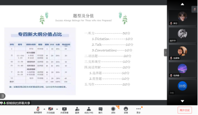 本次会议邀请了2019级英语师范专业凃玮琳等四名同学作经验分享,会上,大家主要围绕考试时间、考试题型、书目推荐以及备考历程等四大方面展开介绍。商务专业的柳婉琪同学就英语专四考试的题型设置和时间安排进行详细说明,英语(师范)专业的凃玮琳同学则结合自身备考经验,为大家逐个介绍各模块的复习方法和注意事项。西班牙语专业的朱露露、方祁铖同学总结概括了西语专四考试中的重难点,并主动分享学习资料,鼓励学弟学妹们调整心态,沉着应对。