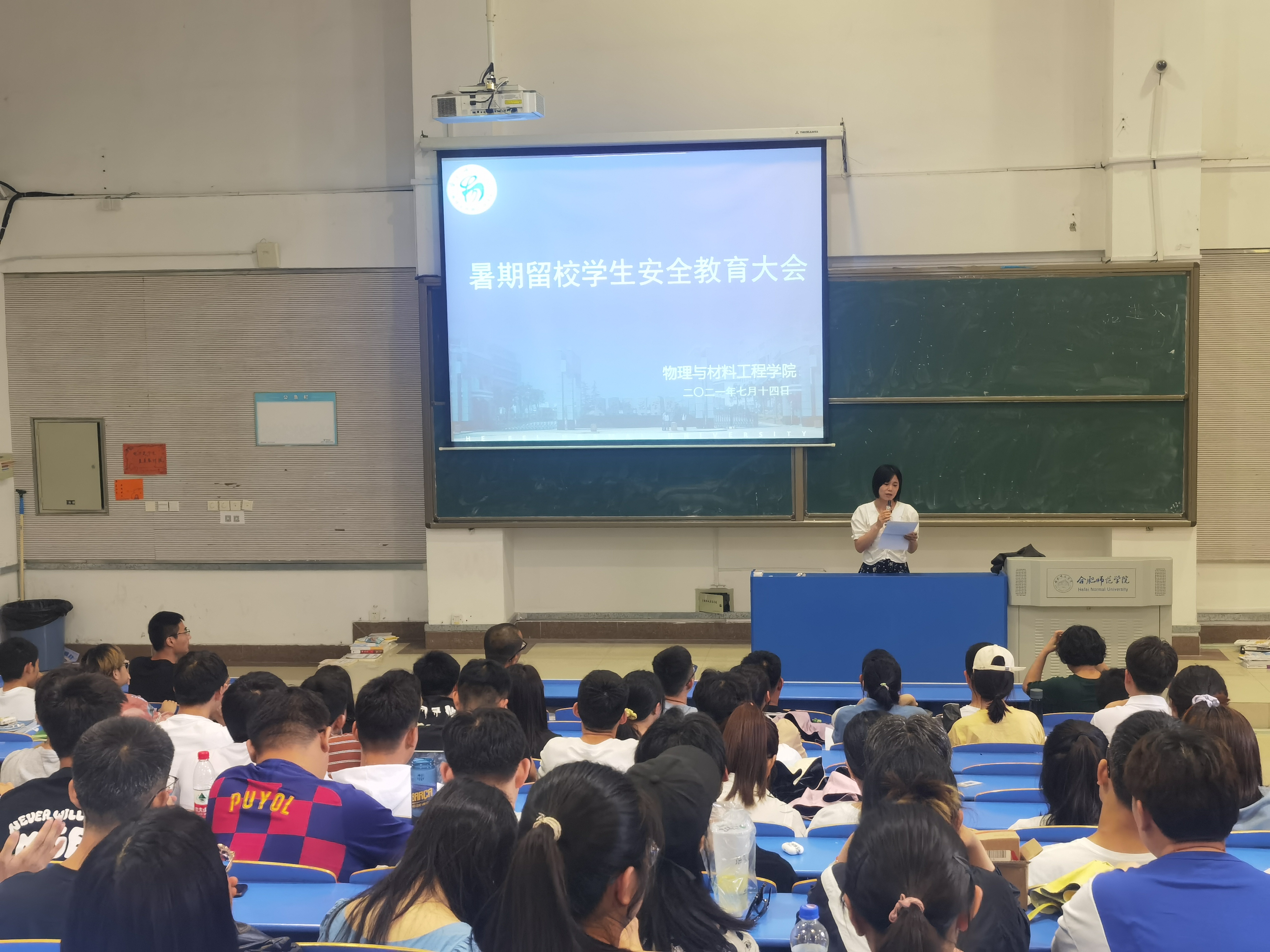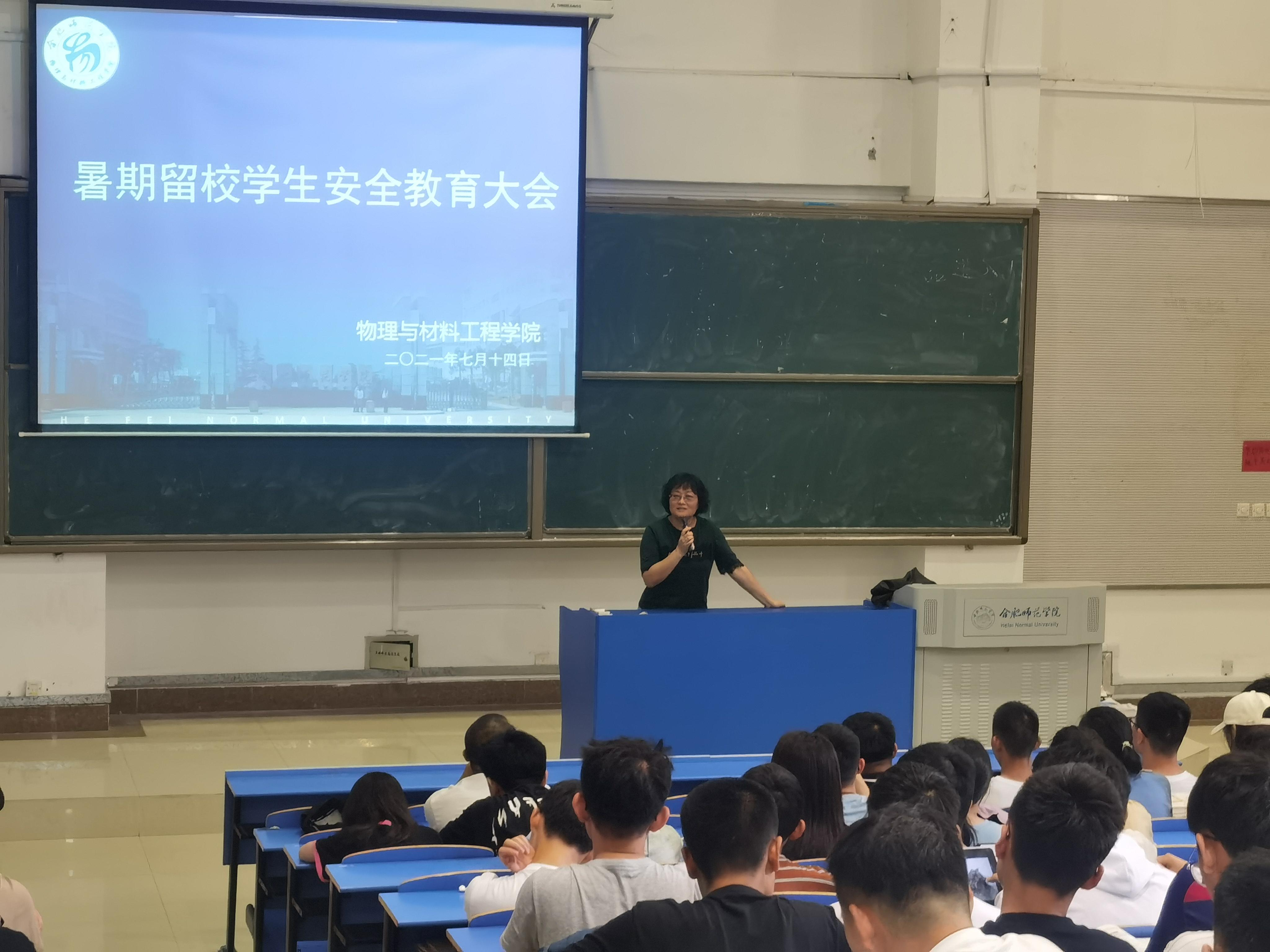 本网讯 为落实学校关于加强暑期留校学生安全工作的要求,物理与材料工程学院于7月14日下午在逸夫楼西阶2教室召开暑假留校学生安全教育大会。会议由辅导员吴梦云主持,学院党委书记唐洁、党委副书记吴震、辅导员赵厚德及全体留校学生参加会议。