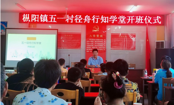 本网讯 7月12日,外国语学院径舟行知学堂在枞阳县五一村村部举行开班仪式,参加本次开班仪式的有五一村党委书记钱春林、7名“小先生”和21名小学员及其家长。