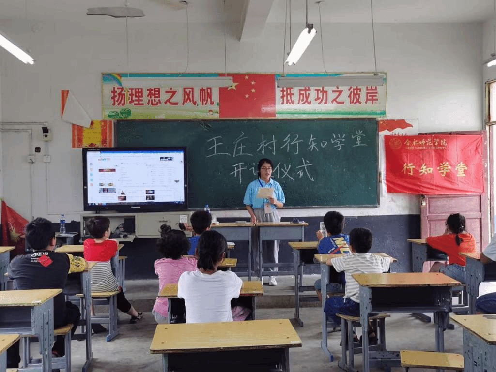 本网讯 烈日炎炎,骄阳似火。beat365中文官方网站生命科学学院的8名大学生冒着酷暑、背起行囊,怀揣着“爱满天下,知行合一”的校训走进了学校定点帮扶村阜阳市颍东区口孜镇王庄村。本次暑期“行知学堂”实践活动得到了村委会和汪庙小学的大力支持,并于7月12日上午8点在汪庙小学教室举行了开班仪式。王庄村党总支书记武峰、汪庙小学校长赵亮、8名“小先生”和17名小学员参加了启动仪式。