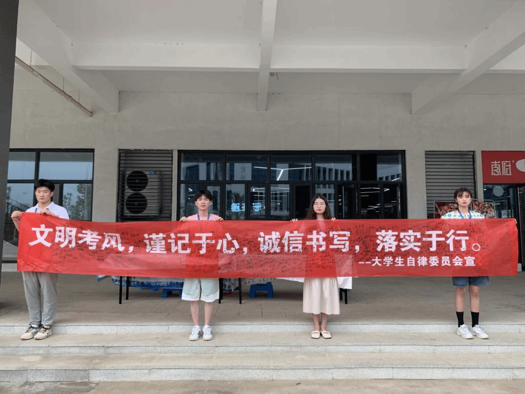本网讯 为营造良好学风,端正考风考纪,加强诚信教育,培养高尚品格,大学生自律委员会分别于于6月27日在滨湖校区,7月3日在锦绣校区开展“文明考风 诚信考试”签名活动。