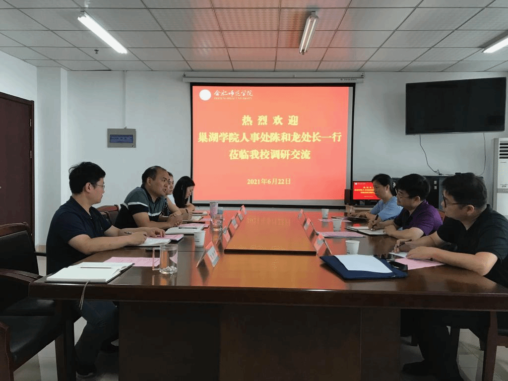 本网讯 6月22日上午,巢湖学院党委教师工作部部长、人事处处长陈和龙一行3人来beat365官网人事处调研交流。学校党委教师工作部部长、人事处处长吴长龙,党委教师工作部副部长、人事处副处长胡婷婷及相关科室负责人接待了陈和龙一行,并进行座谈交流。