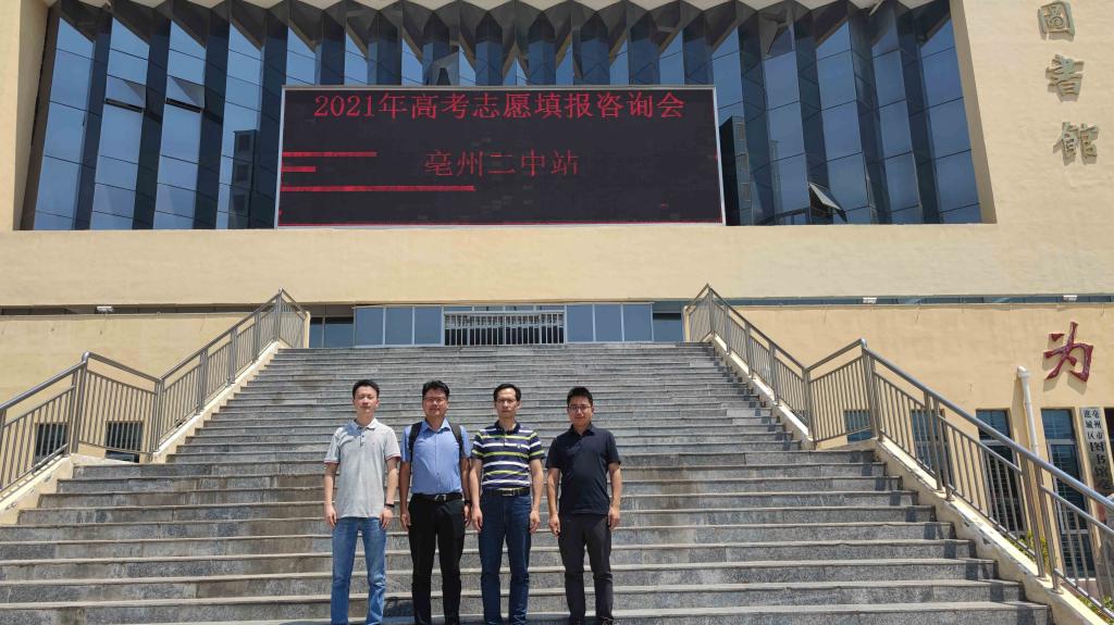本网讯 为助力本科招生工作,落实学校 《关于进一步做好2021年普高招生宣传工作的通知》,吸引优质生源,6月24日上午,电子信息与电气工程学院副院长范程华一行四人来到省示范高中亳州市第二中学进行招生宣讲。本次招生宣讲工作得到了亳州二中校长巩敬耕、校长助理牛富作、高三年级主任于铁柱、总务主任孙刚的热情接待与大力支持。