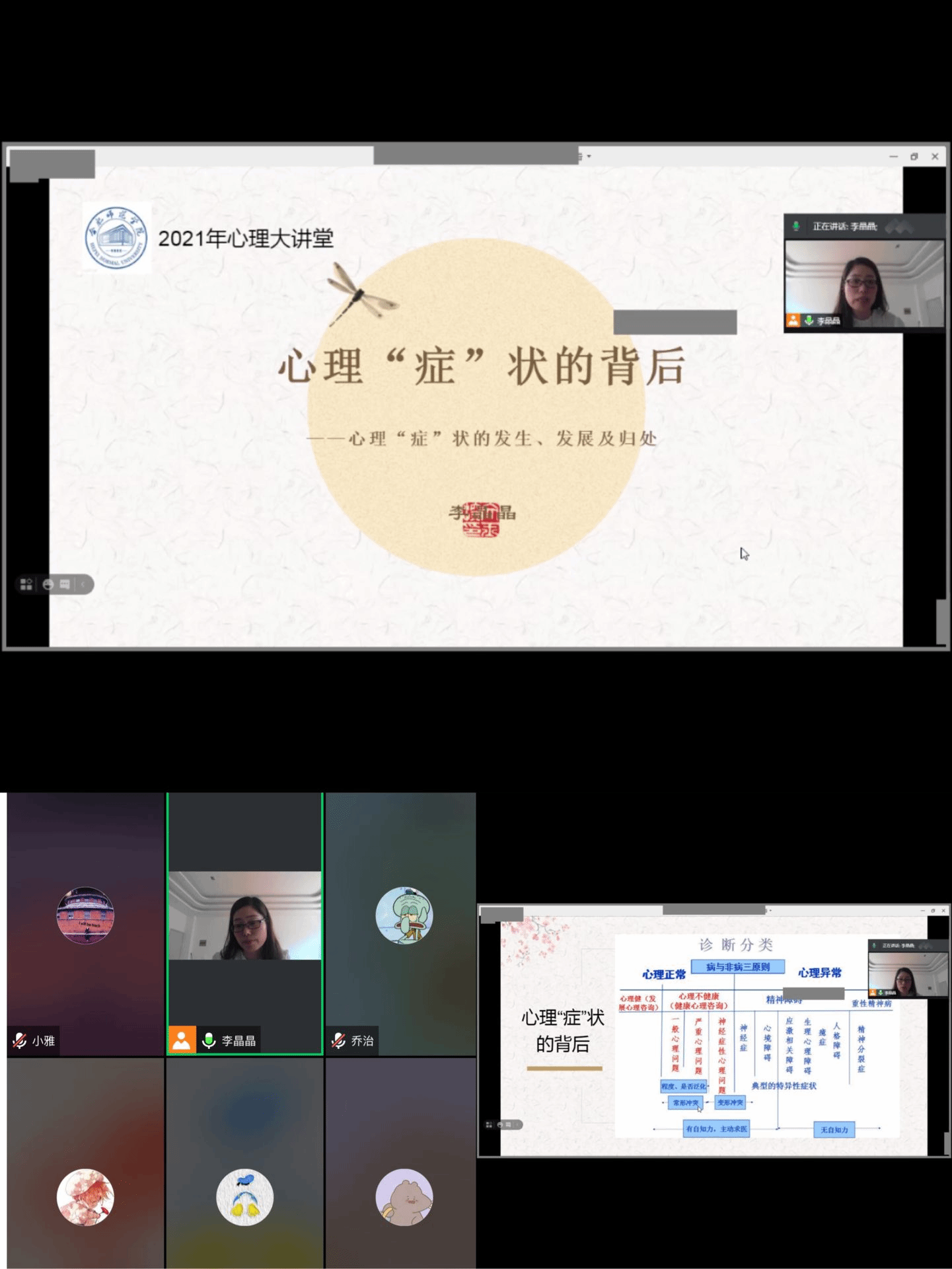 为进一步普及心理健康知识,帮助学生掌握心理调适方法和技巧。6月2日下午,学院邀请校心理健康教育中心李晶晶老师,为我院锦绣校区及滨湖校区的同学带来了一场题为《心理“症”状的背后》的专题心理健康教育讲座。李老师通过介绍大学生常见心理“症”状的表现、识别方法以及应对方式,帮助同学们树立理性平和的心态,勇敢的接纳自己的情绪,从而更好的控制情绪。全院300多位同学在线听取了讲座。