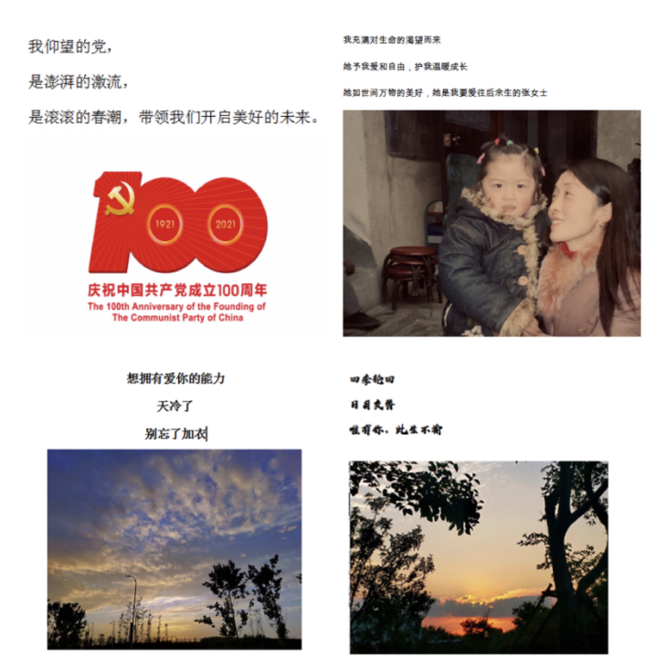 为塑造学生悦纳自我和感恩生活的心理品质,加强校园心理文化建设,艺术传媒学院组织全院同学积极参加“我心我书,情寄三行”三行情书创作大赛。活动期间,各年级同学积极投稿参加,共投出作品59件,作品涵盖庆祝建党100周年、歌颂家乡发展、感悟美好生活、传递人间真情等。活动陶冶了学生的情操,激发了同学们对生活的热爱。