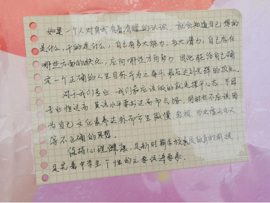 本次活动契合当代大学生的心理需求,采用匿名书信的形式鼓励更多同学学会直面自己的内心,启发学生以乐观积极的态度面对生活中的种种困难,引导学生热爱并且享受生活中的点点滴滴。(物理与材料工程学院:吴梦云)