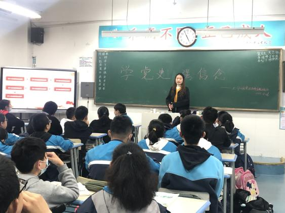 本网讯 为深入推进党史学习教育,把学习成效转化为服务动力,开展好“我为群众办实事”实践活动。4月27日,数学与统计学院学生第一党支部葛梦雪等4名学生党员走进四十六中南校区,在七年级7班开展了以“学习百年党史 奋发青春力量”为主题的党史宣讲活动,为中学生们带来了一场生动的党课。