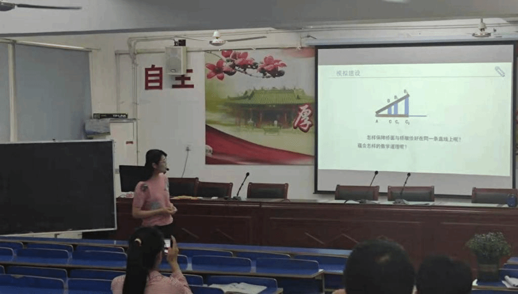 随后,由肥西县上派初级中学数学教师、卫德彬,初中数学名师工作室成员、合肥市青年教师教学技能比赛一等奖获得者刘清清老师进行无生上课、说课《正切》。刘老师通过生活实例——桥的建造引入,抽象出其中蕴含的数学问题,形成正切的概念。运用深厚的文学功底和优美的语言向实习生们展示了一节精彩的无生上课和完整的说课流程,令实习生们收获颇丰。