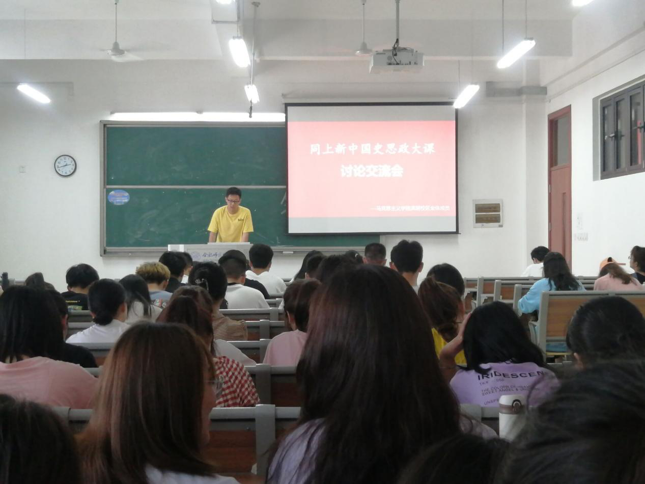 本网讯 为深入贯彻落实习近平总书记关于深化思想政治理论课改革创新和指示批示精神,全面落实习近平总书记在党史学习教育动员大会上的重要讲话精神和《中共中央关于在全党开展党史学习教育的通知》的部署安排,教育部社科司与人民网联合举办“同上‘四史’思政大课”活动。马克思主义学院积极响应学校相关文件要求,高度重视并认真开展“同上‘四史’思政大课”活动,于5月9日下午积极组织2019级、2020级同学在滨湖校区博学楼A312教室和2017级学生在锦绣校区逸夫楼A305进行线上观看直播,本次活动由2017级班长杨俊、2019级班长陈玉钊和2020级班长胡争共同主持。