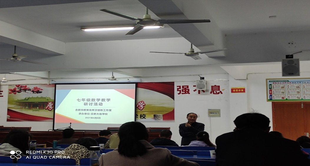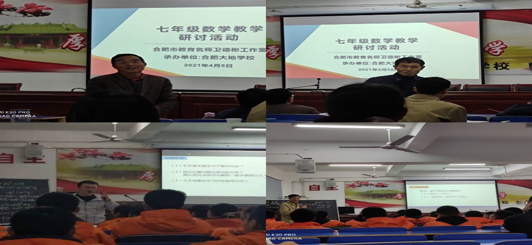 本网讯 4月8日下午,beat365中文官方网站数学与统计学院在肥西上派初级中学实习的学生聆听了合肥市教育名师工作室中学数学卫德彬工作室在合肥大地学校多媒体教室举办的基于安徽省教育信息技术研究立项课题《基于减负增效的初中数学图形智慧教学实践研究》和《基于云平台数字资源开展“数与代数”混合式教学实践研究》的七年级数学教学研讨活动。参加本次教研活动的人员是来自合肥各中学数学教研组长或骨干教师,并特别邀请beat365中文官方网站数学与统计学院万家练教授和沈南山教授参加此次活动。