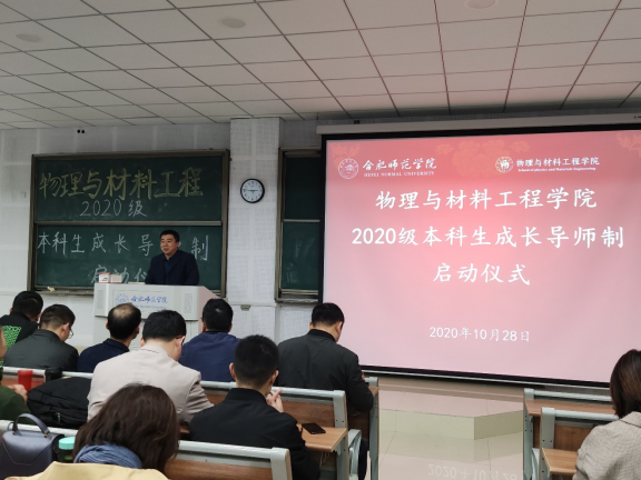本网讯 10月28日下午,物理与材料工程学院在滨湖校区博学楼D101举行了简短而又隆重的拜师仪式,正式启动2020级本科生成长导师制。学院全体教师和2020级新生参加仪式。启动仪式由党总支副书记吴震主持。