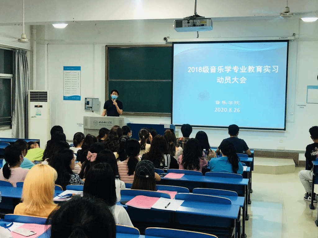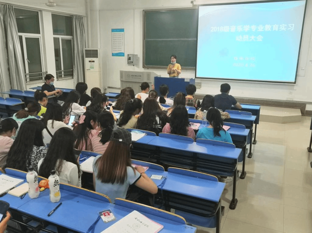 本网讯 8月26日,为积极推进音乐学院2018级音乐学专业师范生实习工作的全面开展,2018级师范生教育实习动员大会在逸夫楼A201举行,音乐学院党总支副书记蔡成梅、音乐学院副院长李劲松、全体辅导员老师以及2018级音乐学专业返校的57名师范生参加了此次会议,会议由副院长李劲松主持。