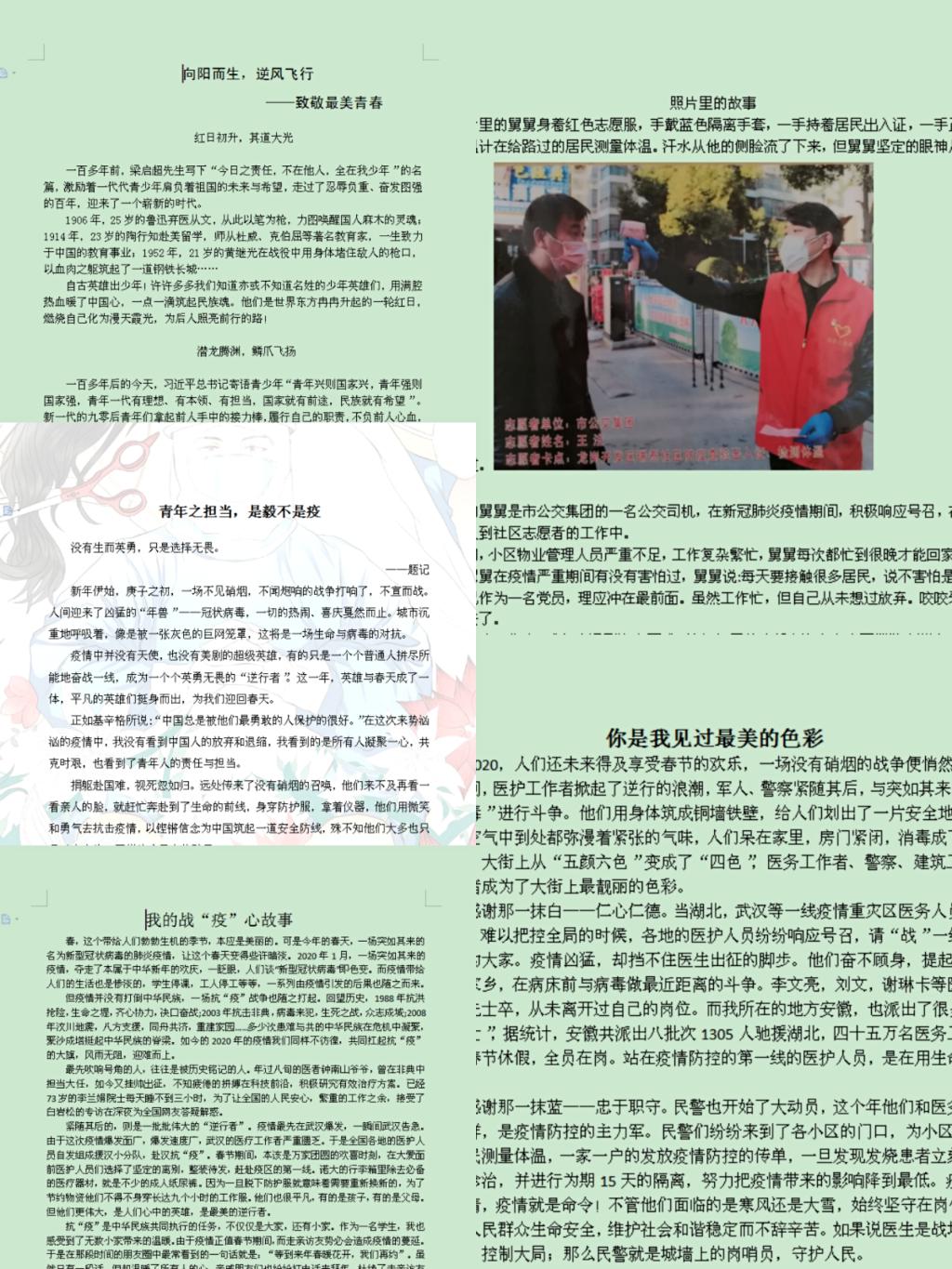 二是“我的战‘疫’心故事”征文比赛初选。经过各年级辅导员的广泛宣传,全院共有25个学生提交作品。经过学院评选,推荐5个作品参加学校决赛,分别为17级汉语言文学2班陈晴《向阳而生,逆风飞行》、18级汉语言文学2班刘婧《青年之担当,是毅不是疫》、18级网媒2班方文国《我的战‘疫’心故事》、19级编辑出版二班王欢《照片里的故事》、19级编辑出版一班马紫毓《你是我见过最美丽的色彩》。文院学子用质朴的语言书写了疫情期间对生活、人生及生命的思考。
