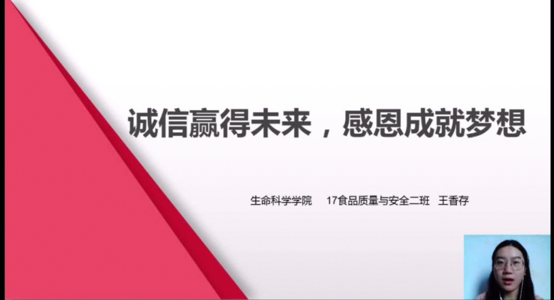 一是举办了一次线上主题班会。各年级辅导员通过召开线上主题班会,提高同学对诚信、感恩重要性的认识,努力加强自我修养,身体力行,争做一个讲诚信、懂感恩的人。各班级全员参与,通过主题班会强化学生诚信感恩意识。