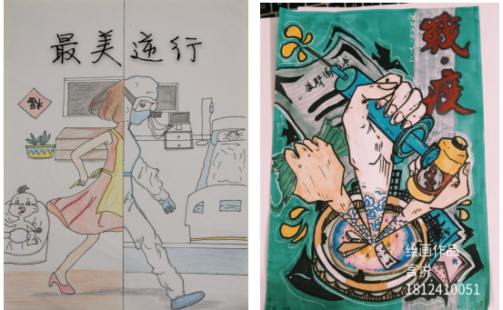 作品表达了对武汉等疫情高风险地区人民的关心关切以及对积极投身防控疫情华夏儿女的崇高敬意,更传达了合师师生对抗击疫情阻击战的必胜决心。很多同学还通过线上观影活动在家进行创作,共300多名学生参加。大家以多种艺术形式记录疫情期间坚守一线抗疫的工作人员、志愿服务人员,更好的展示和宣传他们疫情中坚守初心,防控中主动担当使命的精神为国家、为生命、为这场“战疫”中平凡而又伟大的人们加油呐喊一起打赢这场与病毒之间的战斗!在观看完纪录片后,同学们反响热烈,各抒己见,每人提交了一份300字的观影心得,充分表达了对一线工作人员的敬佩、表达了对打赢疫情防控攻坚战的信心。同时,参加活动的学生用画笔积极行动,努力创作,用一幅幅作品表达自己对一线抗击疫情的英雄们的深情致敬。这些作品中,有致敬奋战在抗疫一线的白衣天使,有讴歌抗击疫情的建设者,有致敬默默奉献的志愿者和社区工作人员,还有对居家隔离,疫情防控知识的宣传等,涵盖了多种表现形式,寓意深刻。