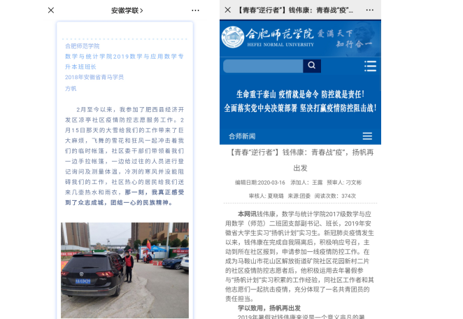无志愿,不青春。新冠肺炎疫情发生以来,数学与统计学院学子积极响应国家和学校的号召,陆续投入到疫情防控志愿服务工作中。截至4月7日数学与统计学院已有34名志愿者参与了疫情防控志愿服务工作,其中党员7人,共青团员27人。其中2019级数学与应用数学专升本班方帆的事迹得到了安徽学联的报道,2017级数学与应用数学师范二班钱伟康的事迹得到了校官网、合师青年《青春“逆行者”》栏目的报道。广大党员志愿者在防疫一线上激扬青春力量,以实际行动书写着青春篇章。