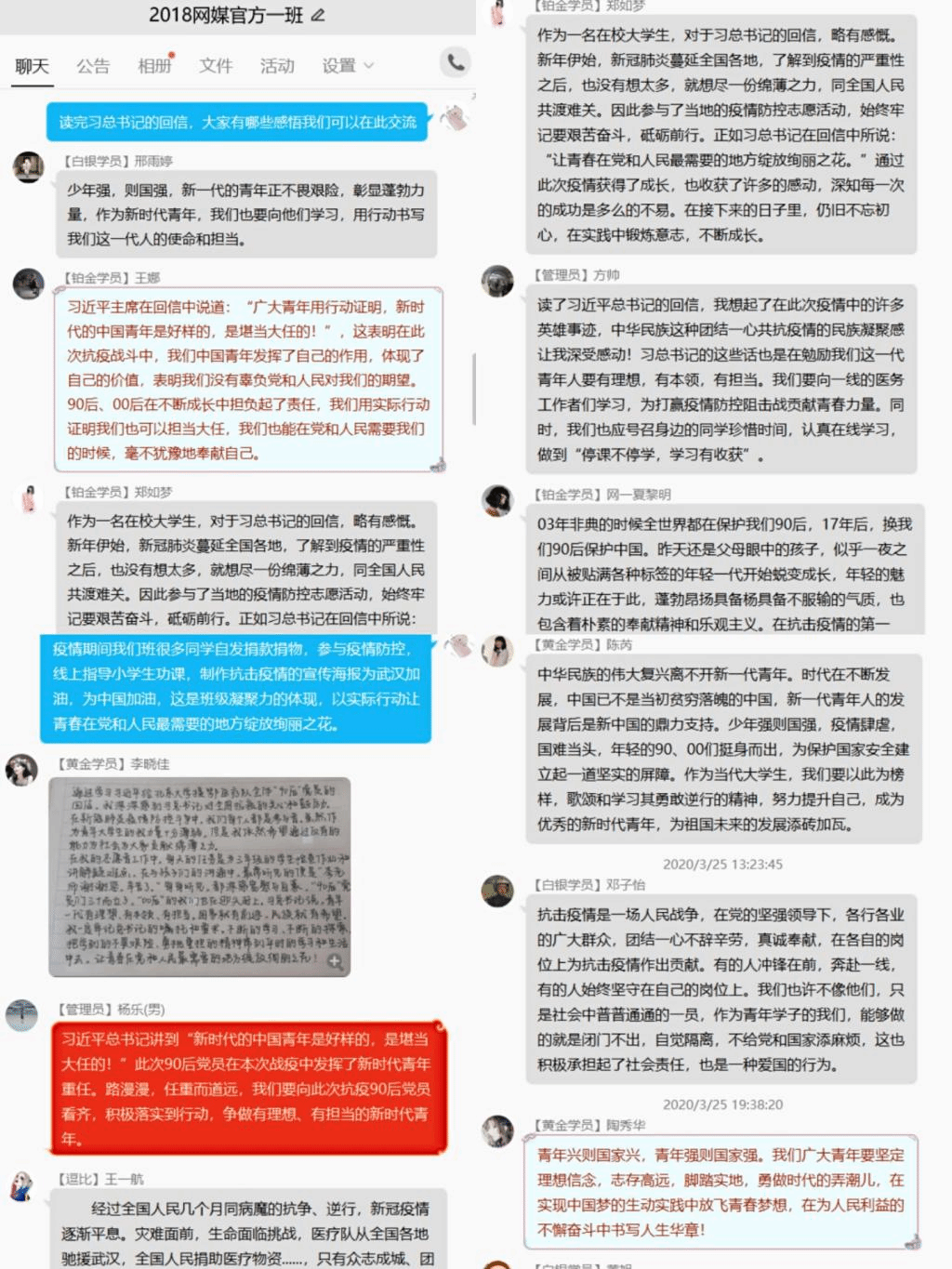 本网讯 3月25日下午,为了深入学习习近平总书记给北京大学援鄂医疗队全体90后党员的重要回信,文学院分团委组织团员青年开展了“学习习近平总书记给北京大学援鄂医疗队全体90后党员重要回信精神”活动。