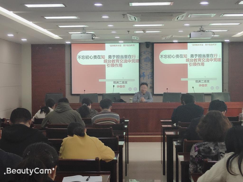 本网讯 根据学院主题教育领导小组统一部署和安排,机关二总支精心筹划、认真组织“总支书记上党课”和“支部书记上党课”活动。近日机关二总支和下辖九个支部分别举办“书记上党课”活动。11月6日下午,二总支召集全体党员进行专题党课学习教育活动。总支书记许俊农结合自己前期调查研究所取得的成果和发现的问题,做了“不忘初心贵在知、勇于担当重在行——皖台教育交流中党建引领作用”的专题党课。