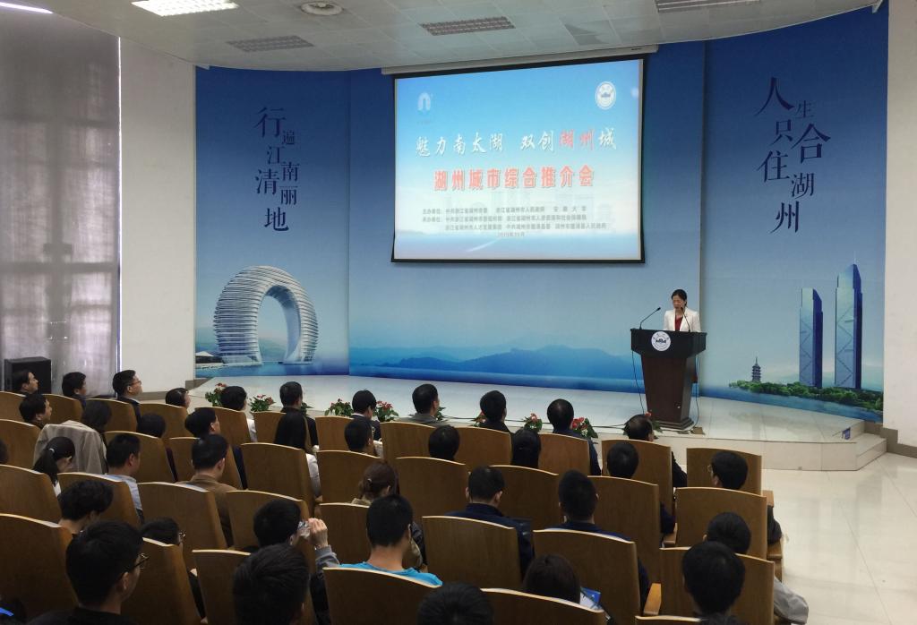 马平等同毕业生一道首先来到博学北楼参加综合推介会,观看湖州市情宣传片,听取城市主题推介和大学生就业创业政策宣讲,详细了解湖州为吸引优秀大学生创新创业所采取的举措。