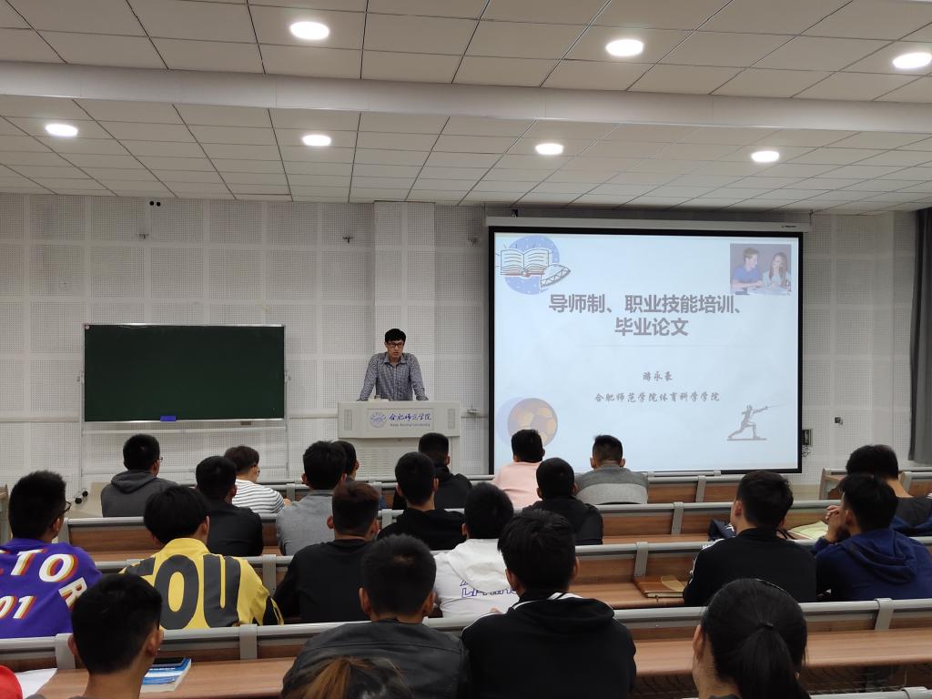本网讯 为了进一步让体育专业新生充分了解导师制,提高专业训练能力,10月10日晚,体育科学学院在滨湖校区博学楼D101教室开展以“导师制,职业技能培训和毕业论文指导”为主题的新生入学教育,运动训练系主任游永豪副教授主讲,辅导员张康康及2019级全体新生参加。