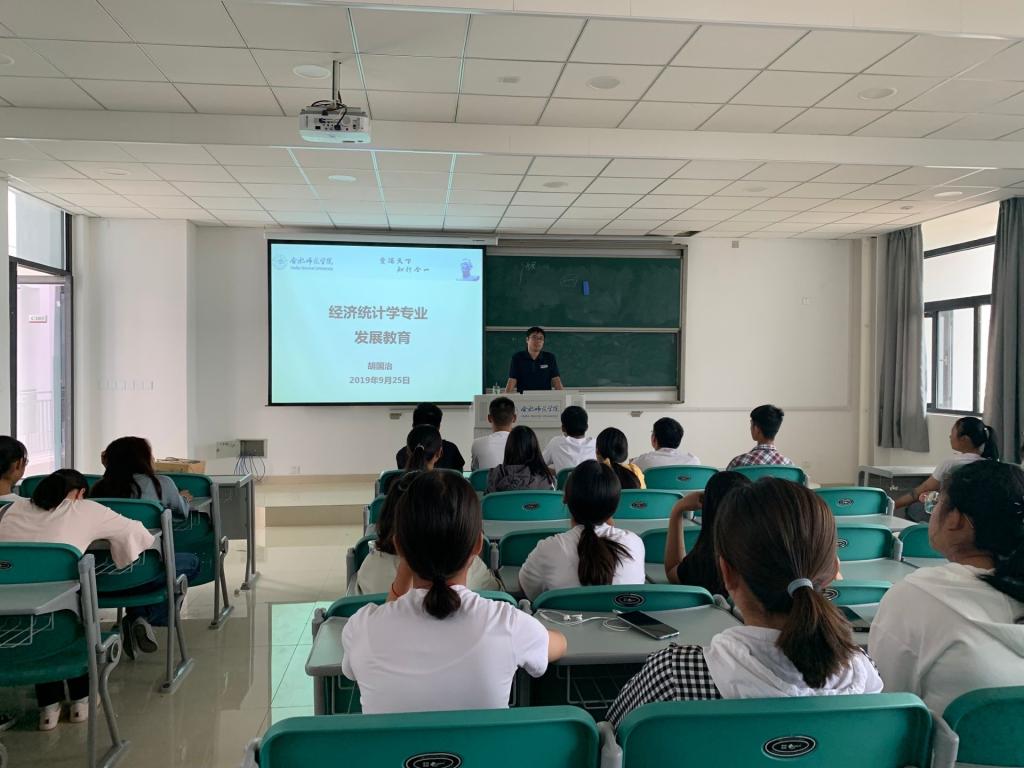 经济统计学的专业发展教育课程由经济统计学专业负责人胡国治博士进行讲授。经济统计学专业是卓越统计师培养试点专业。该专业致力于培养具有良好的数学与经济学素养,能够熟练掌握并运用计算机进行数据的处理和分析,多方面共同发展的高级实用型人才。胡国治在课上介绍了统计学的发展历史,强调了经济统计学专业对学生坚实的经济学和数学、统计学基础以及良好的创新意识和开拓精神的要求,同时,胡国治老师使用大量例子分析了统计学专业学生良好的发展前景。