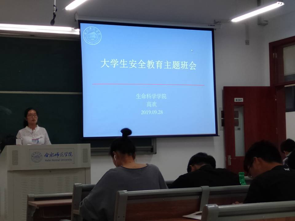 9月23日,生命科学学院党总支书记郭桃芬在新生入学教育期间做了两场安全教育专题讲座,强调了安全的重要性,提醒新生要注意校内外住宿安全,社会安全,出行安全、网络安全、学籍安全以及女生交友安全等各种安全问题。郭桃芬结合学校和社会安全事故案例以及自己亲身经历告诫同学们“寝室防火”的重要性,强调校园网贷和网络社交的危害,交通车辆的选择,影响学籍安全的因素,电信诈骗的手段等等,并指出滨湖校区地理位置较偏,同学们更应该注意安全,夜间尽量不要外出,尤其是女生,注意人身安全。