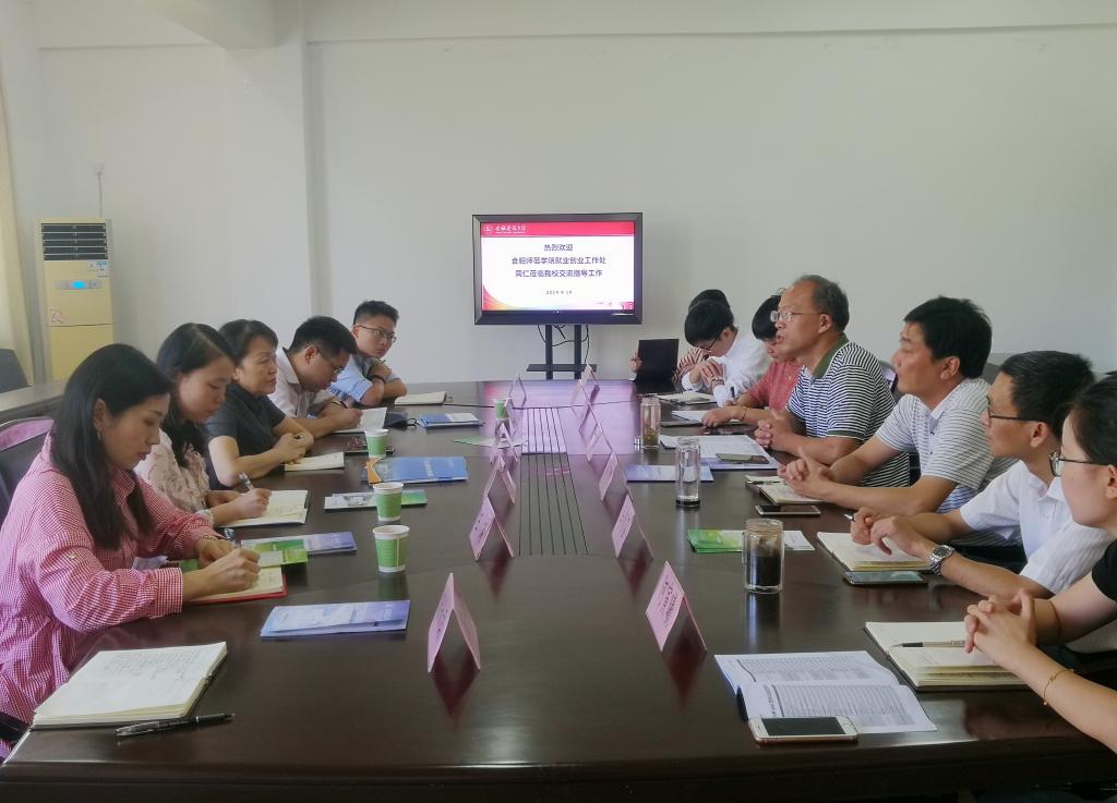 安徽建筑大学就业工作处处长魏东、副处长唐黎等热情接待了马平一行。双方进行了座谈交流。魏东首先对马平等一行人的来访表示热烈欢迎,他详细介绍了安徽建筑大学就业工作处机构职能、人员组成、经费保障、就业市场建设、创新创业指导、大学生职业生涯规划与就业指导和创业基础课程建设等情况,分享了在学生就业创业工作中的有效做法和有益经验。