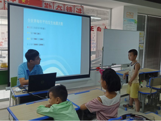 讲座主要通过展示唐山大地震现场照片及相关影视资料,并结合世界范围内地震的普遍案例,详细阐明地震的巨大破坏性,为小学员们普及震级的相关知识,生动地向小朋友们说明了地震来临前小动物们的异常行为、地光与地声等,并指导孩子们在地震预警的短短几秒内应该采取的措施。随后,“小先生”又向各位小学员阐述在地震来临时,身处不同区域和遇到特殊情况下如何进行自保和逃生,遭到掩埋该如何生存等。小学员们在浓厚的防震学习氛围中获益匪浅,课堂气氛十分活跃,大家积极举手回答问题。通过这场讲座,小学员们不仅学习了防震措施,而且对地质知识有了深入的了解,纷纷表示要认真学习防护知识,提高生存能力。