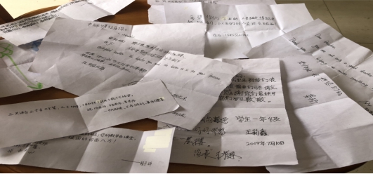 活动中,孩子们认真思考,在纸上工工整整地写下了自己的心里话,并在活动后带回家中,交给自己的家人。令“小先生”们意外的是,第二天的课堂上,孩子们纷纷将自己写给“小先生”的话放在讲桌上,其中甚至还有家长对“小先生”们的支持与鼓励。