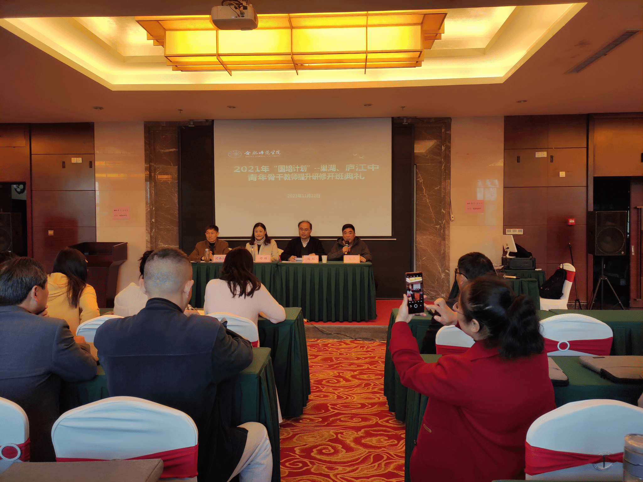 11月22日上午,由beat365中文官方网站承办的巢湖市、庐江县2021年“国培计划”——中青年骨干教师提升研修(数学学科)2023年第三期集中培训班在天宫国际大酒店举行开班典礼,数学与统计学院党委书记穆娟、副院长杨刘、项目负责人沈南山和来自巢湖市、庐江县的全体参训学员出席了典礼,典礼由班主任王志主持。