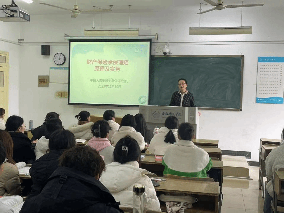 为进一步深化人才培养模式改革,推进校企合作和产教融合,促进学院应用型人才培养高质量发展,全面提升学生应用能力, 11月30日上午,数学与统计学院邀请中国人寿财险安徽省分公司高级专员金宁为2021级金融工程专业学生讲授《保险学原理》课程。