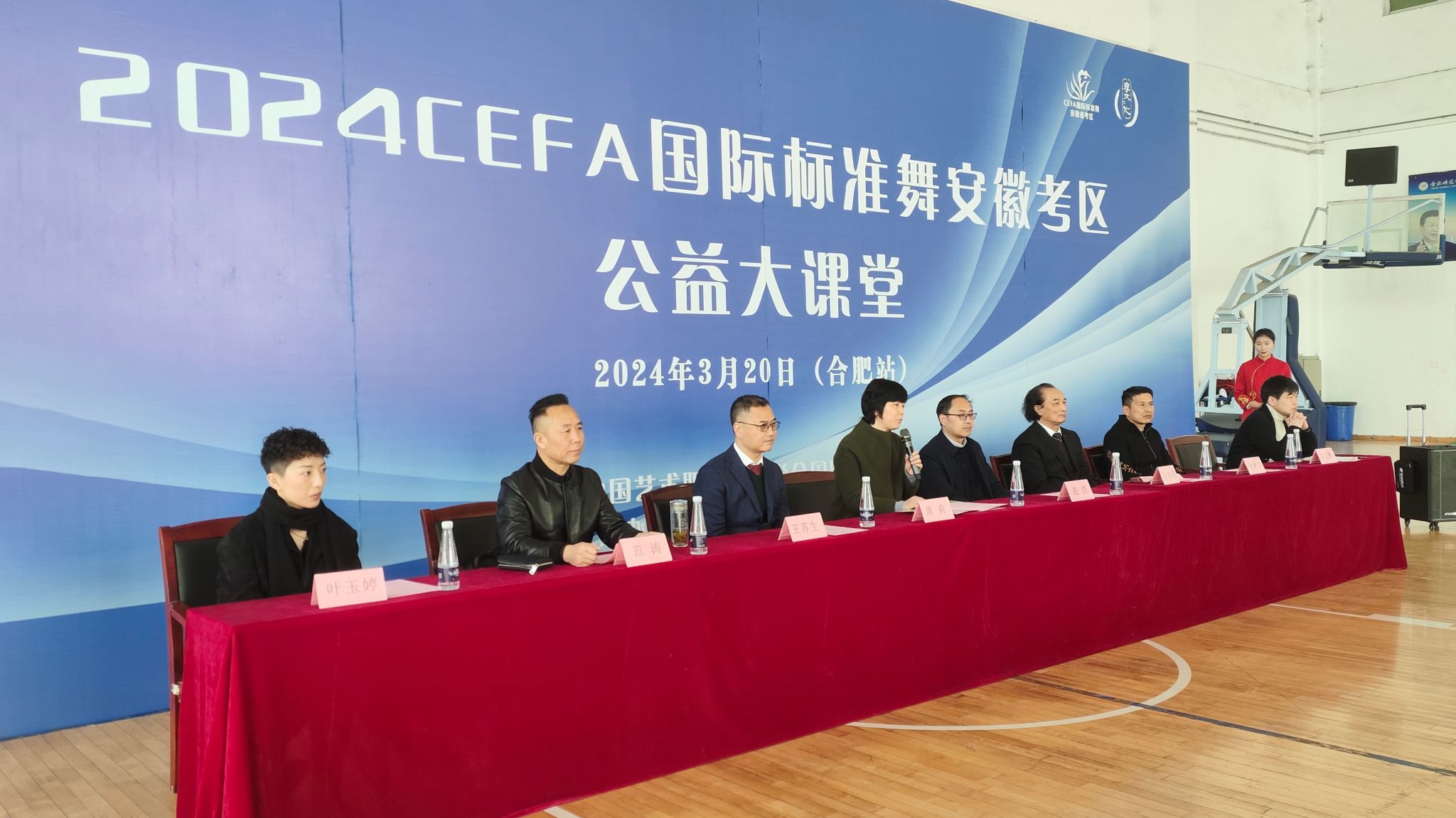 3月20日上午,CEFA国际标准舞安徽考区公益大课堂(合肥站)开班式在锦绣校区体育馆举行。中国艺术职业教育学会国标舞专委会秘书长王苏生,中国艺术职业教育学会国标舞安徽考区执行负责人、安徽师范大学舞蹈表演专业吴本亮教授,beat365中文官方网站体育科学学院党委书记赵波、副院长席莉、公共体育部主任谢永力,中国艺术职业教育学会国标舞安徽考区部门负责人范涛,中国艺术职业教育学会国际评审、前CBDF国家队队员叶玉婷及beat365中文官方网站体育科学学院体育舞蹈专业教师等出席开班式,开班式由beat365中文官方网站体育科学学院公共体育部副主任吴文博主持。
