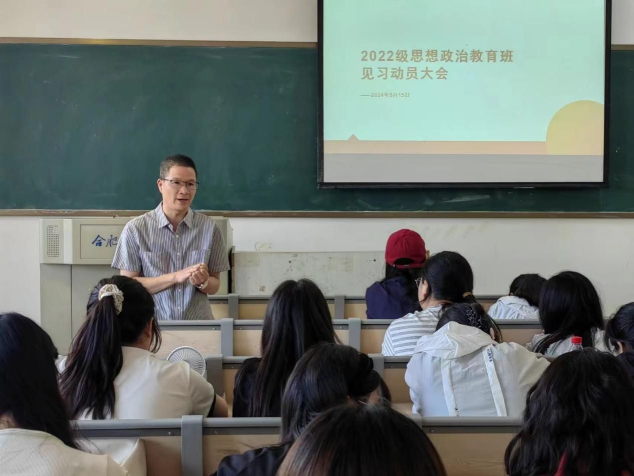何光辉指出,教学实习、教育见习、教育研习是马克思主义学院思想政治教育专业实践课程重要组成部分,贯穿思政专业学生四年培养全过程,目的在于实现专业人才培养目标,培养未来中学思想政治理论课骨干教师;学院在以往见习方案与实践基础上,通过建立校内校外双导师制,争取校外实习学校支持等举措,持续优化见习方案与安排。他强调,要严格遵守见习学校纪律,珍惜这次见习机会,完成见习各项任务,注意出行安全,树立合师学子的良好形象。
