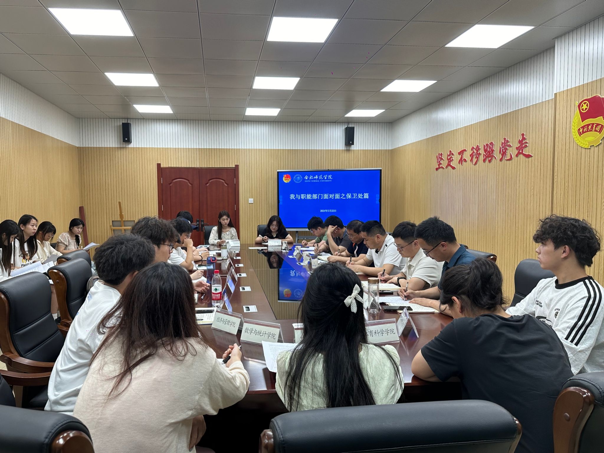 为切实加强青年学生思想政治引领,更好倾听同学们的诉求,筑牢安全防线,5月23日中午,院团委、保卫处在锦绣校区共青之家联合举办“我与职能部门面对面”交流活动。保卫处处长杜文龙,院团委书记、学生工作处处长刁文彬,保卫处副处长束道锋,院团委副书记何磊,来自两校区的学委会及各二级学院学生代表参加活动。