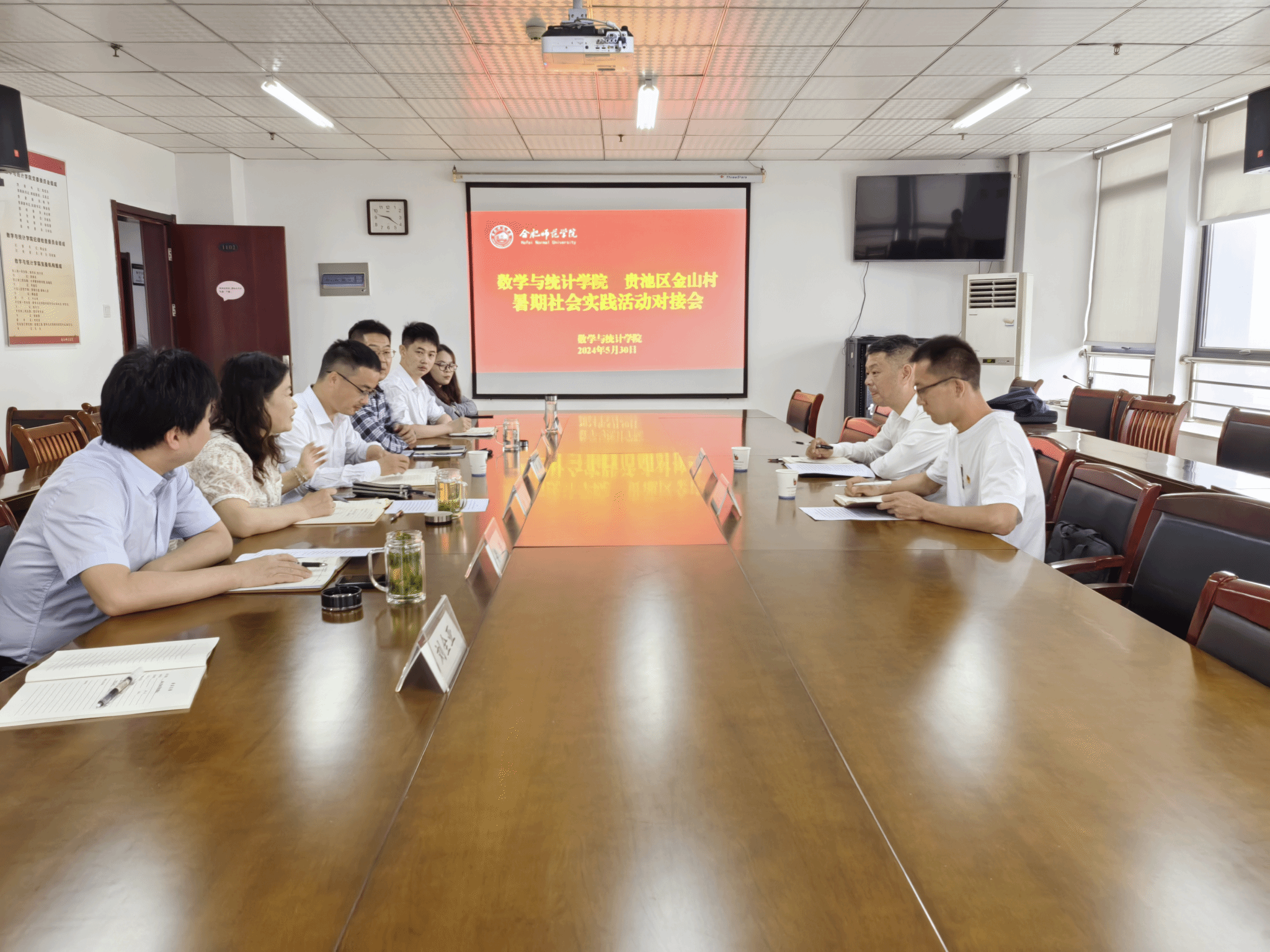 5月30日上午,池州市金山村党委书记吴正德,民兵营长肖诚诚来数学与统计学院洽谈暑期社会实践合作事宜,数学与统计学院党委书记穆娟、副书记陶金昌、副院长黄浩,分团委负责人、行知学堂指导教师和学生代表参加会议。会议邀请了校团委副书记何磊到会指导。