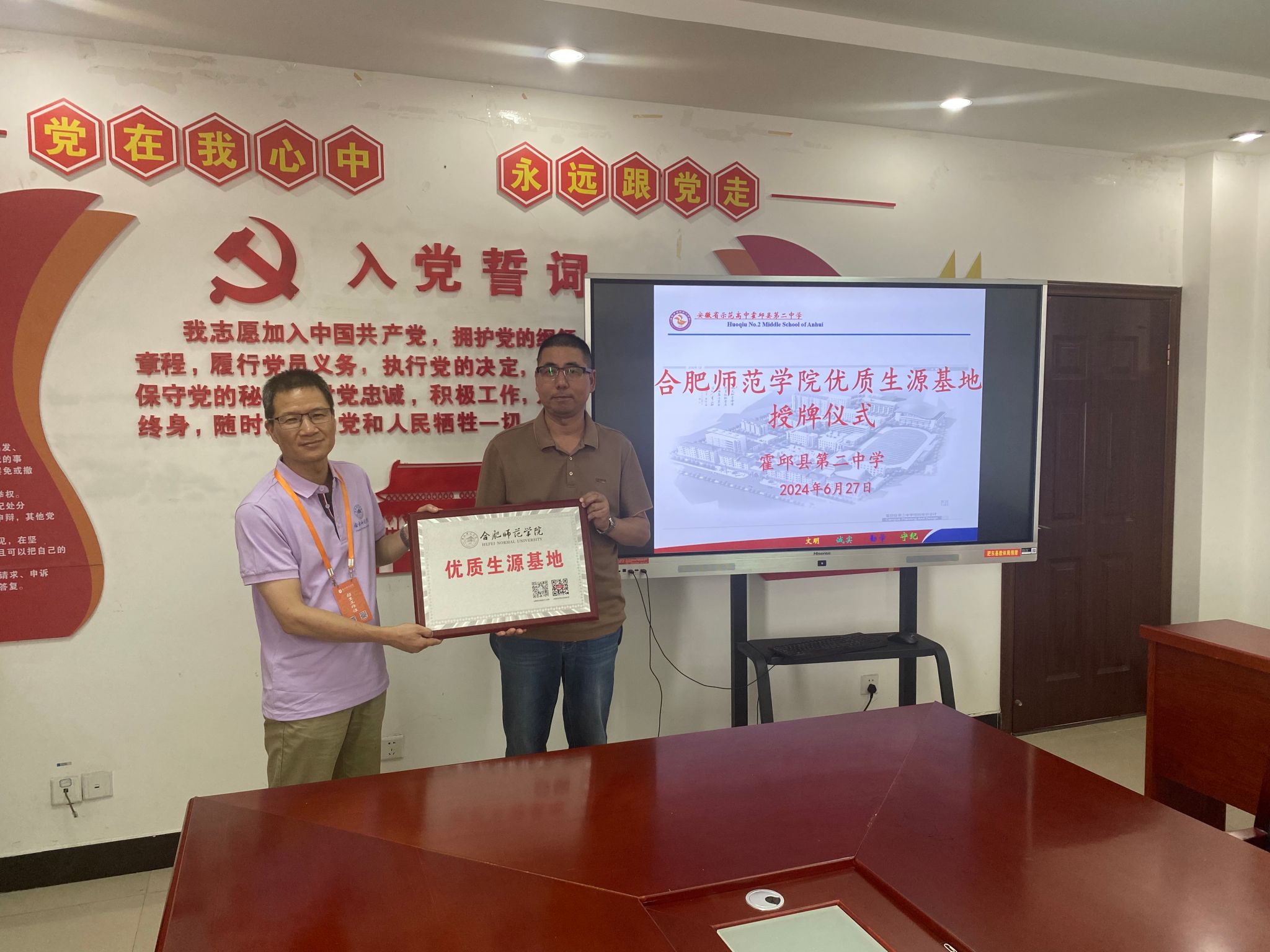 在霍邱二中,举行了beat365中文官方网站“优质生源基地”授牌仪式。近年来,霍邱二中一直是beat365官网优质生源大户,2023年,该校为beat365中文官方网站输送了28位优秀学子。何光辉代表学校同该校教务处主任方礁签订了优质生源基地合作协议,表达了深化两校育人合作,吸引更多优质生源报考beat365官网的愿望。