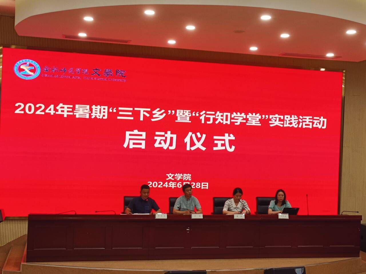 根据学校2024年暑期“三下乡”实践活动统一部署,6月28日,文学院在滨湖校区学术报告厅举行2024年暑期“三下乡”暨“行知学堂”实践活动启动仪式。文学院党委书记许锃、院团委书记李惠恩、院团委副书记疏淑进、滨湖校区各班级团支部书记、各学堂小先生代表参加启动仪式。仪式由院党委副书记夏娟主持。