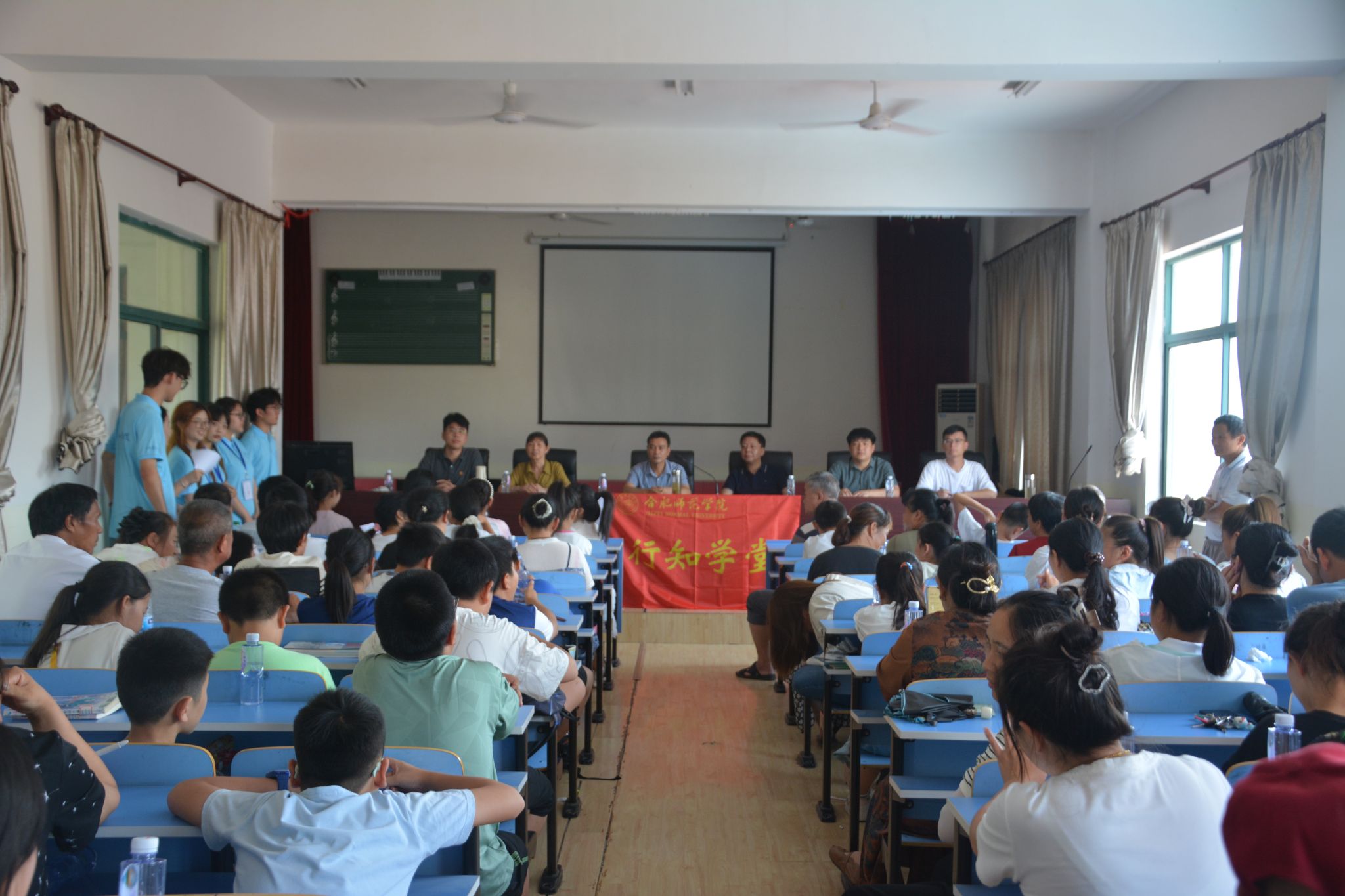 7月8日上午,院团委铜陵金榔行知学堂在铜陵市义安区金榔初级中学顺利开班。铜陵市义安区钟鸣镇工会主席汪宗新,义安区钟鸣镇妇联主席徐小翠,金榔中学校长钱朝亮,金榔中学教导主任、我院数学与统计学院2014届校友何淼,金榔中学办公室主任胡文杰,我院团委教师、学堂指导教师王露,6位“小先生”和40余名小学员及其家长参加开班仪式。
