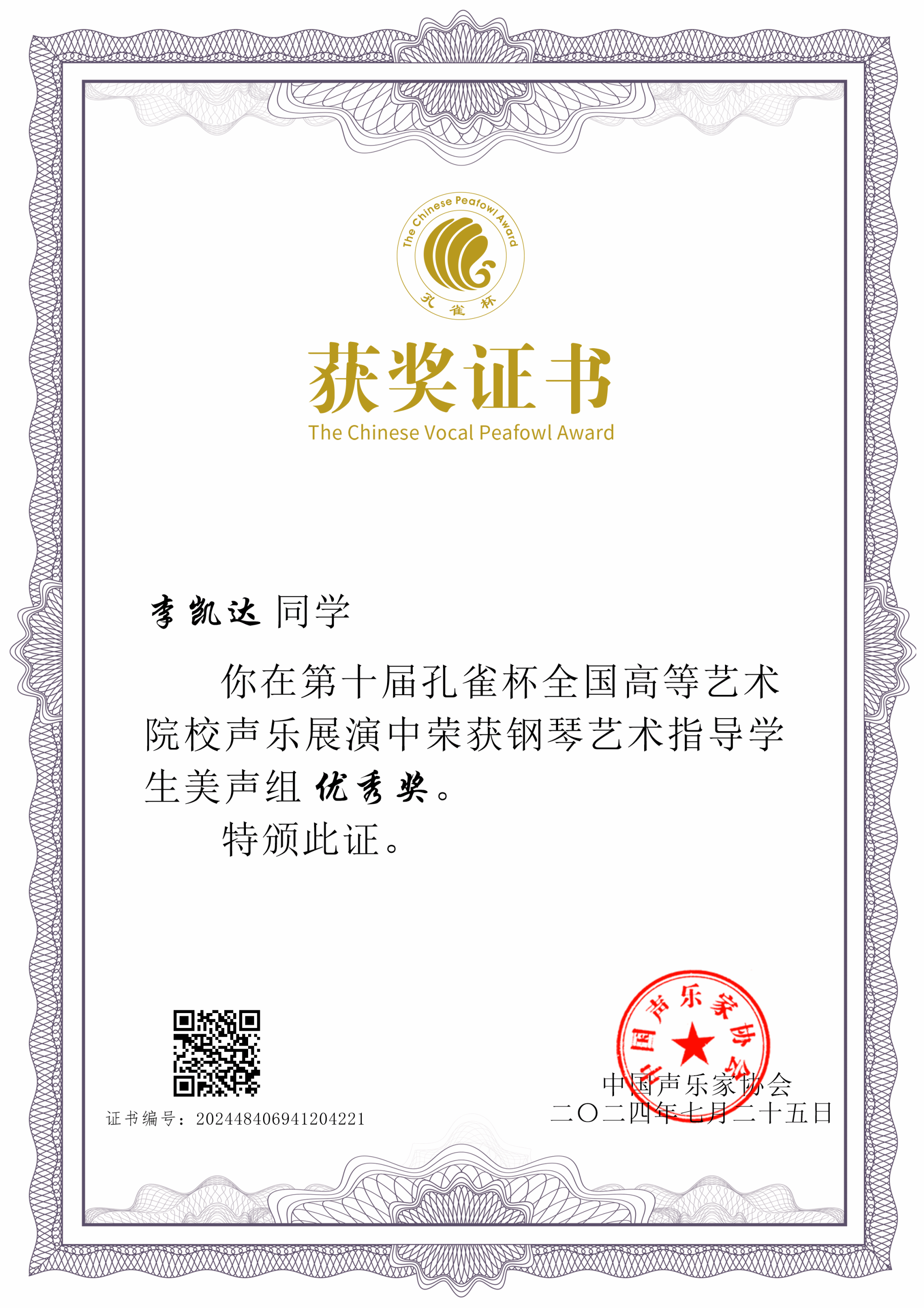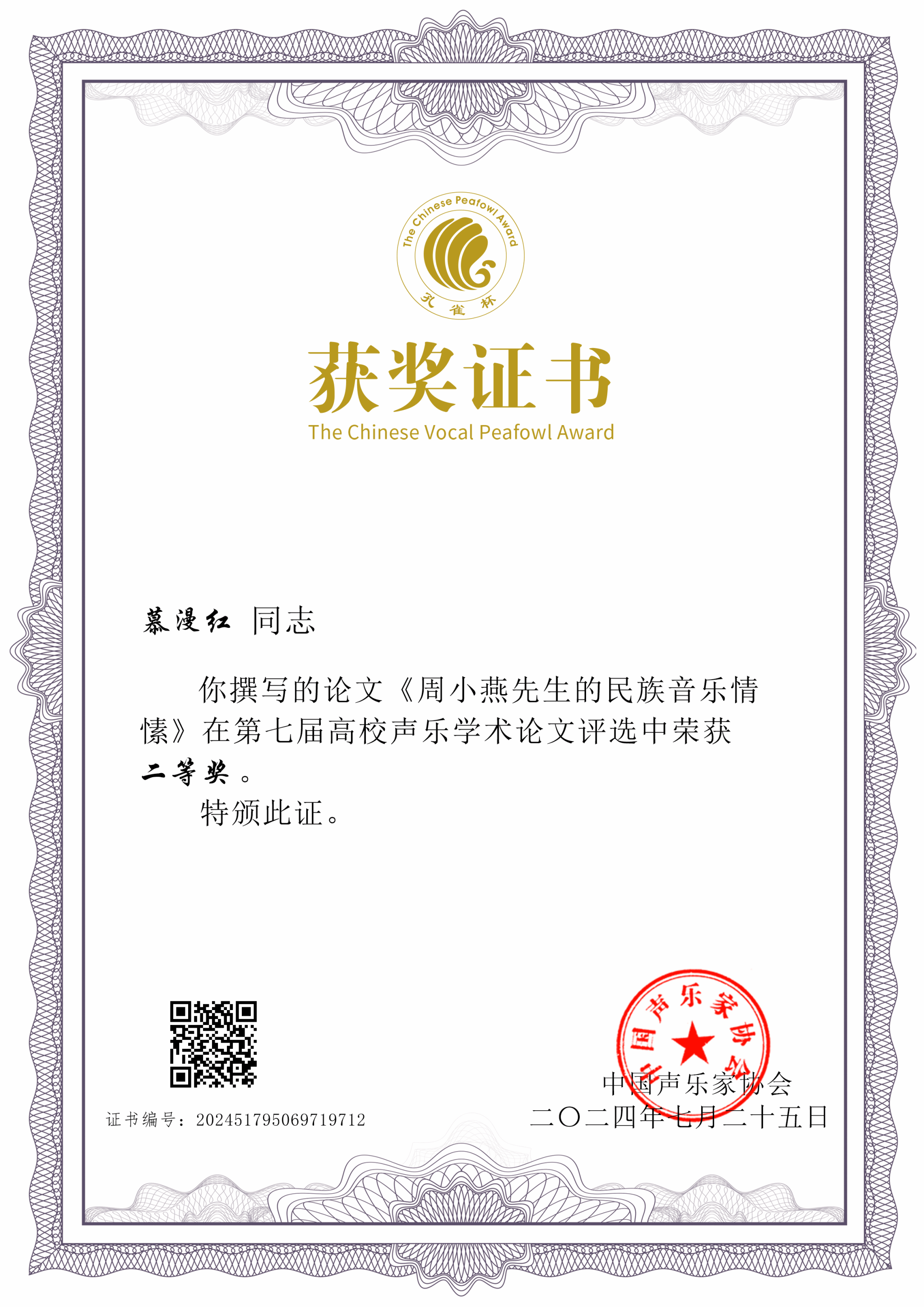 近日,备受关注的“第十届孔雀杯高等艺术院校声乐展演暨第八届高校声乐学术交流活动”日前在广州落下帷幕,我院师生在近4000名展演选手中表现突出,在参加的3个组别展演中均取得不错成绩,其中慕漫红获“高校声乐学术论文”教师组二等奖,李韵涵获“综合师范院校本科生美声组”优秀奖(指导教师谢梦柯、苏丽丽),李凯达获“钢琴艺术指导学生美声组”优秀奖(指导教师叶蕾),音乐学院获颁优秀组织奖。