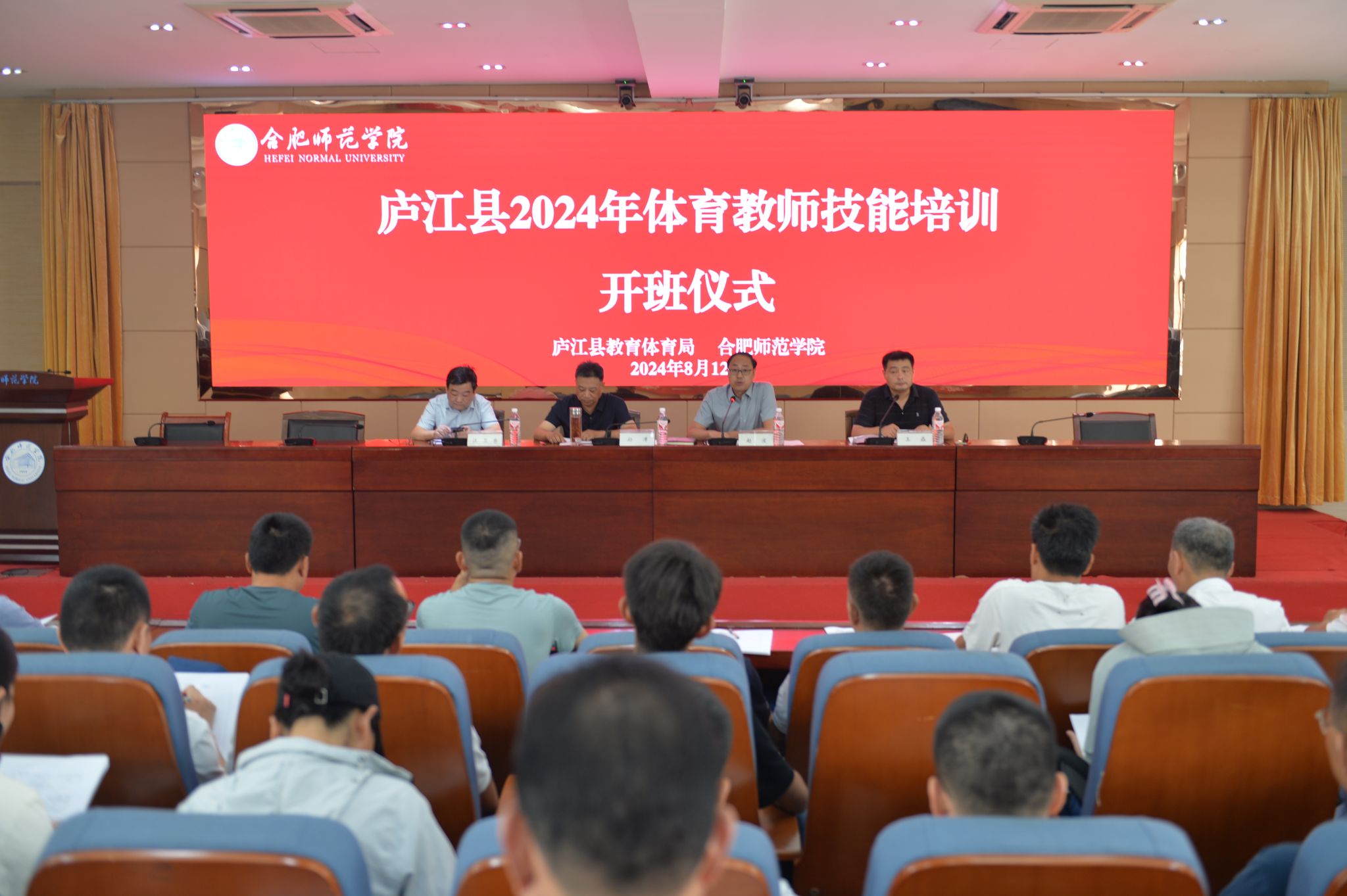 8月12日上午,培训班开班仪式在锦绣校区学术报告厅举行,庐江县政府教育督导室主任、教体局党委委员孙溥,庐江县教育体育局教研室主任汪卫东,beat365中文官方网站体育科学学院党委书记赵波出席开班仪式,开班仪式由beat365中文官方网站继续教育学院副院长王磊主持。