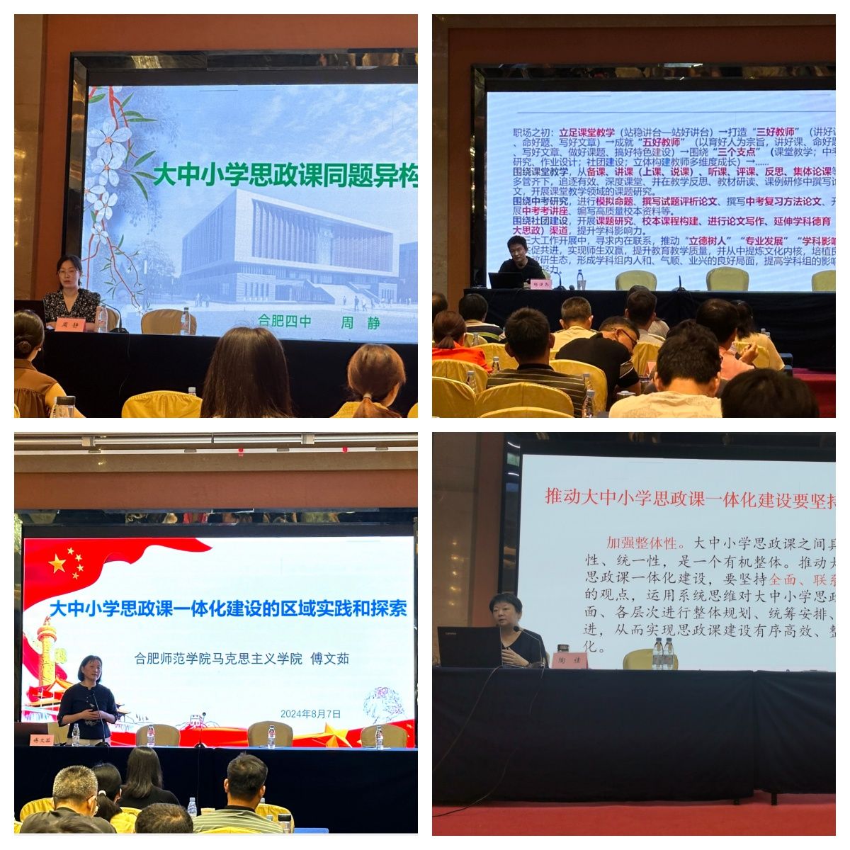 安徽省大中小学思政课一体化建设专家指导组组长刘新跃介绍了大中小学思想政治教育一体化建设的历史、安徽省建设现状与未来展望。合肥市名师工作室领衔人杨使兵结合自己的成长经历,强调了教研赋能教师专业化发展的重要性。合肥市第四中学政治学科主任周静从理论和实践两个角度诠释了思政课“同题异构”教学设计。上海师范大学马克思主义学院思政教师教育教研室主任刘建良给大家带来了大中小学思政教育一体化建设的上海实践经验。合肥市梦园小学教育集团校长邵春荣结合自身经历介绍了中小学教师如何做好课题研究。庐江县教育体育局教研员陶佳总结了庐江县近几年来在中小学思政课一体化建设的生动实践经验,强调要坚持系统思维来指导庐江县的继续探索工作。beat365官网马克思主义学院朱玉利和傅文茹两位专家,分别围绕弘扬“教育家精神”与合肥市一体化建设成果做了专题报告,并得到参训学员的好评。