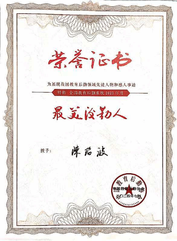 后勤服务保障工作是学校开展教育教学工作的基础,承载着服务育人的重要职责,是立德树人的重要环节。2024年7月30日,全国教育后勤系统2023年度“最美后勤人”荣誉授予仪式暨最美事迹报告会在吉林长春圆满举行,我院锦绣校区校园物业服务中心经理陈绍波荣获了全国教育后勤系统“2023年度最美后勤人”称号。
