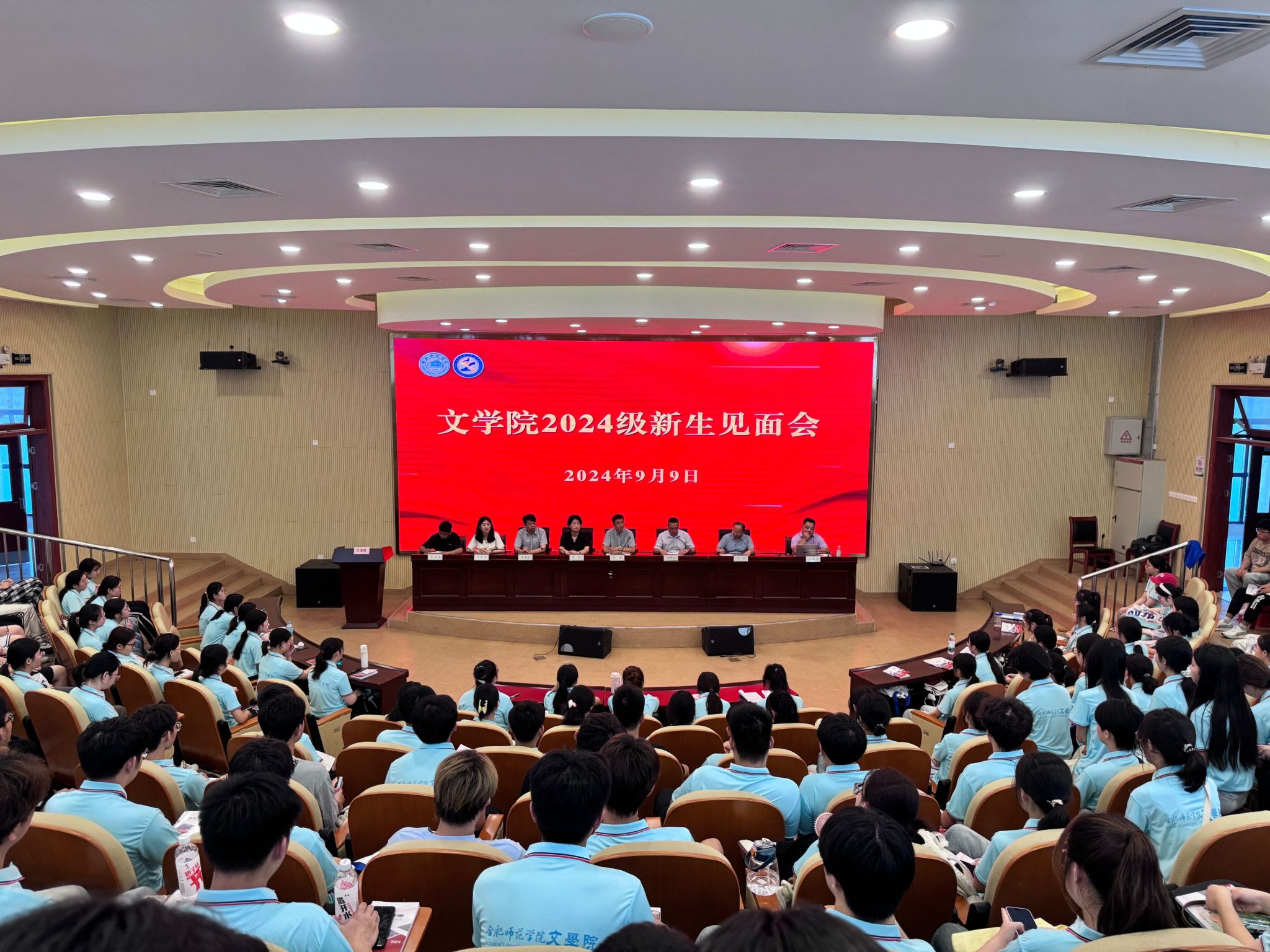 9月9日,文学院在滨湖校区学术报告厅举行2024级本科新生见面会。学院党委书记许锃、院长何旺生、党委副书记夏娟、副院长甘松和各系主任、新生辅导员及2024级全体本科新生300余人参加见面会。会议由许锃主持。