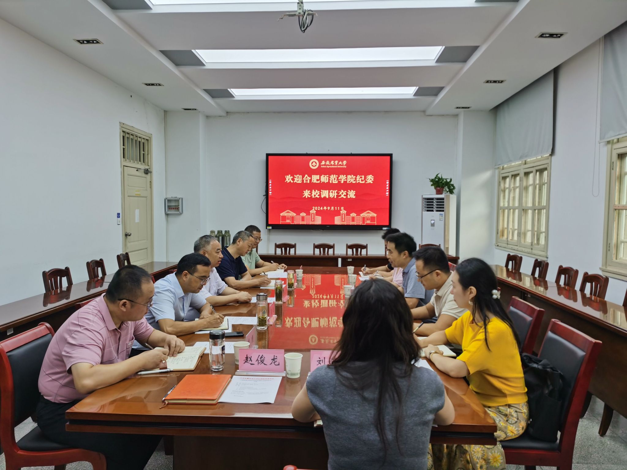 陈文兵向调研组介绍了安徽农业大学认真落实省委“办大办好办强安徽农大”指示要求以及校纪委履行监督责任情况;彭庆刚结合纪检监察有关制度和上级纪委有关要求,交流了从事纪检监察工作以来的经验和体会,介绍了学校纪委在信访办理、线索处置、审查调查及审理、重点领域关键环节监督、政治生态分析、二级纪委建设等方面的主要做法和成效;姚为久介绍了安徽中医药大学纪委政治监督、纪巡审联动、案件查办、党风廉政意见回复、警示教育、暖心回访、纪检监察干部队伍建设等方面的主要做法。双方就工作中的具体业务学习、实践、规范化等方面进行了深入地交流和探讨。