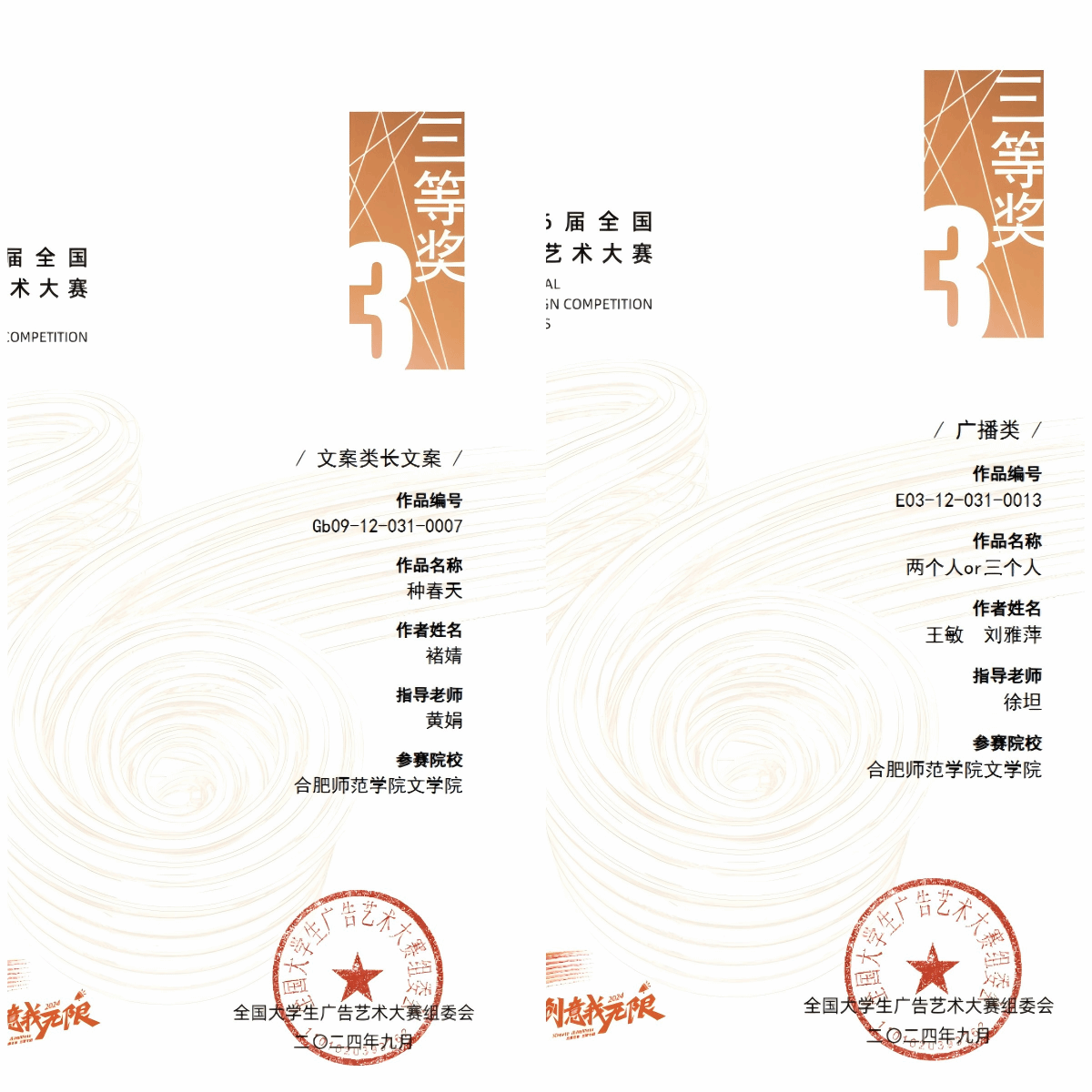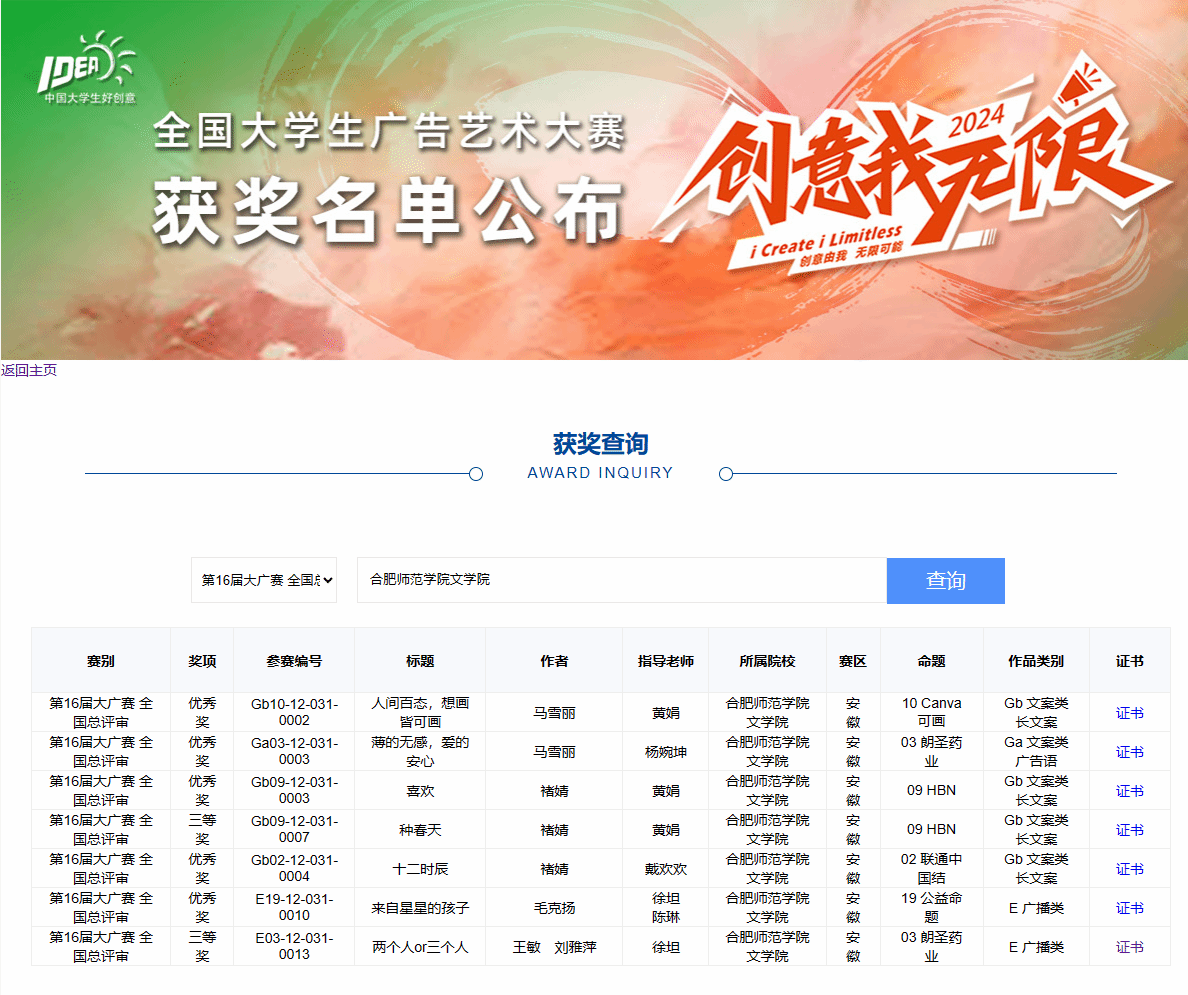 近日,第十六届全国大学生广告艺术大赛(简称“大广赛”)全国总评审结果正式公布。经过激烈角逐,文学院师生再创佳绩,共获得7项国家级奖项、35项省级奖项,其中国家级三等奖2项,国家级优秀奖5项,安徽赛区一等奖13项、二等奖10项、三等奖12项,文学院在全国赛区及安徽赛区获奖数量,创近年来参赛成绩新高。