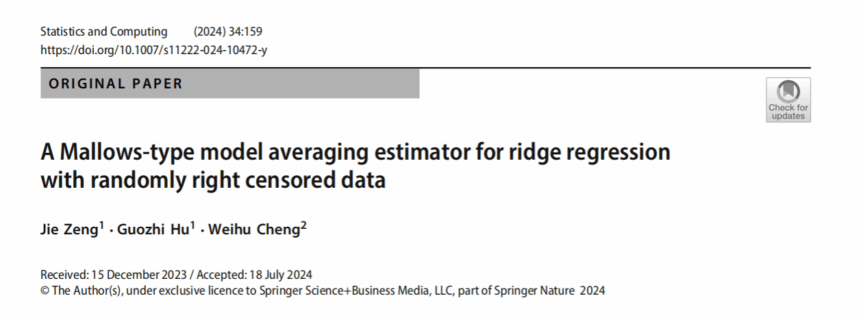近期,数学与统计学院“基础数学”安徽省重点学科应用统计与分析团队博士曾婕、胡国治在最优模型平均领域取得进展,相关成果A Mallows-type model averaging estimator for ridge regression with randomly right censored data在统计学权威期刊《Statistics and Computing》(中科院二区、JCR一区)上公开发表。