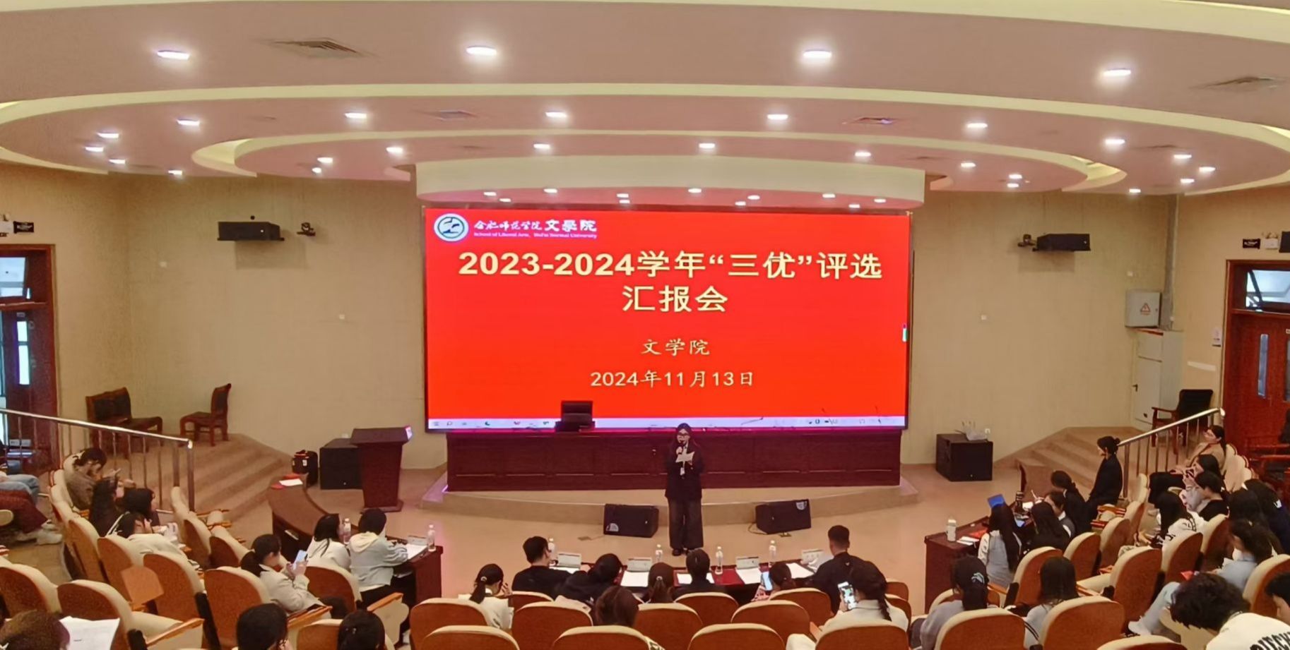 为进一步加强学风建设,营造“比学赶帮、相互促进、共同提高”的浓厚学习氛围,11月13日下午,文学院在滨湖校区学术报告厅举办2023-2024学年“三优”创建评选汇报会,学院党委负责人、各年级辅导员,滨湖校区学生干部以及创建班级、宿舍汇报人参加汇报会。