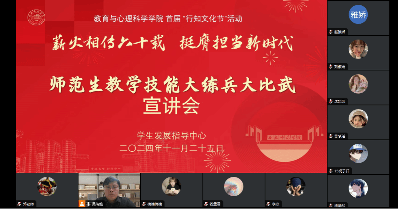 为进一步强化师范生教育教学技能,提升学生的综合竞争力和职业发展力,11月25日晚,教育与心理科学学院召开师范生教学技能大练兵大比武活动线上宣讲会。会议由教育与心理科学学院学生发展指导中心主任吴皖赣主持,郭辰、晋玉等老师以及2021、2022级近百位学生参加宣讲会,2023、2024级学生同步在班级教室集体观摩。