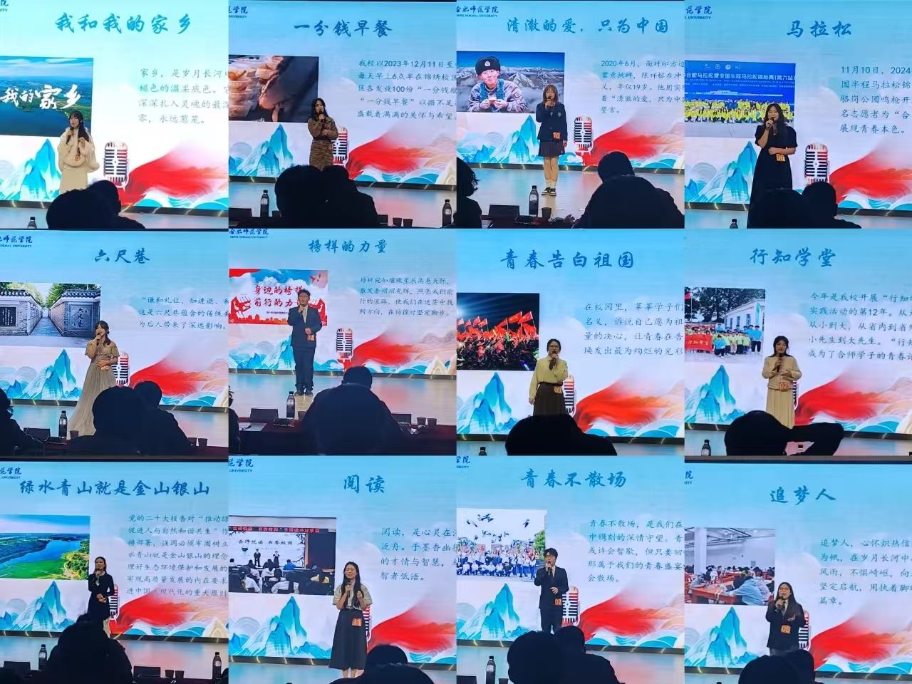 比赛在教育与心理科学学院带来的开场舞蹈《不如见一面》中拉开了帷幕。在选手自我介绍环节,12位选手分别为“幸福合师”“美丽合师”“活力合师”“奋进合师”“创新合师”“志愿合师”“感动合师”“温暖合师”“健康合师”“平安合师”“梦想合师”“青春合师”代言,表达出“爱校为家 以校为荣”的心情和决心。