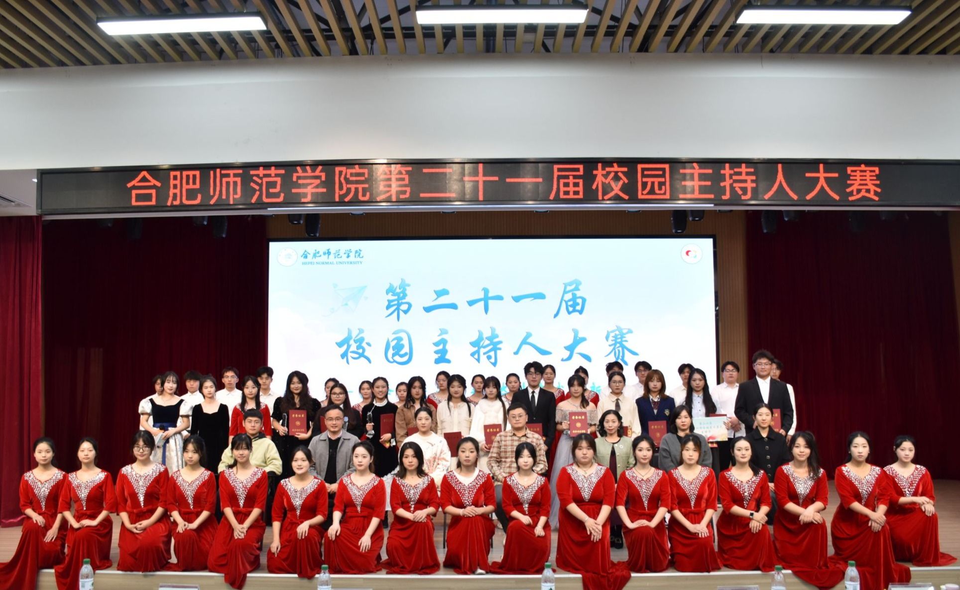 以话筒为介,为合师代言,为青春代言。为进一步繁荣校园文化,挖掘和培养具有潜力的校园主持人,根据校园文化艺术节活动安排,11月27日晚,由院团委主办,学生社团文化服务中心承办的“演绎未来正青春,奋斗有我展新声”第二十一届校园主持人大赛决赛于锦绣校区大学生活动中心顺利举行。院团委书记、学生工作处处长刁文彬,院团委副书记何磊,以及来自学校相关单位的部分专业老师担任评委。300余名学生现场观看比赛。
